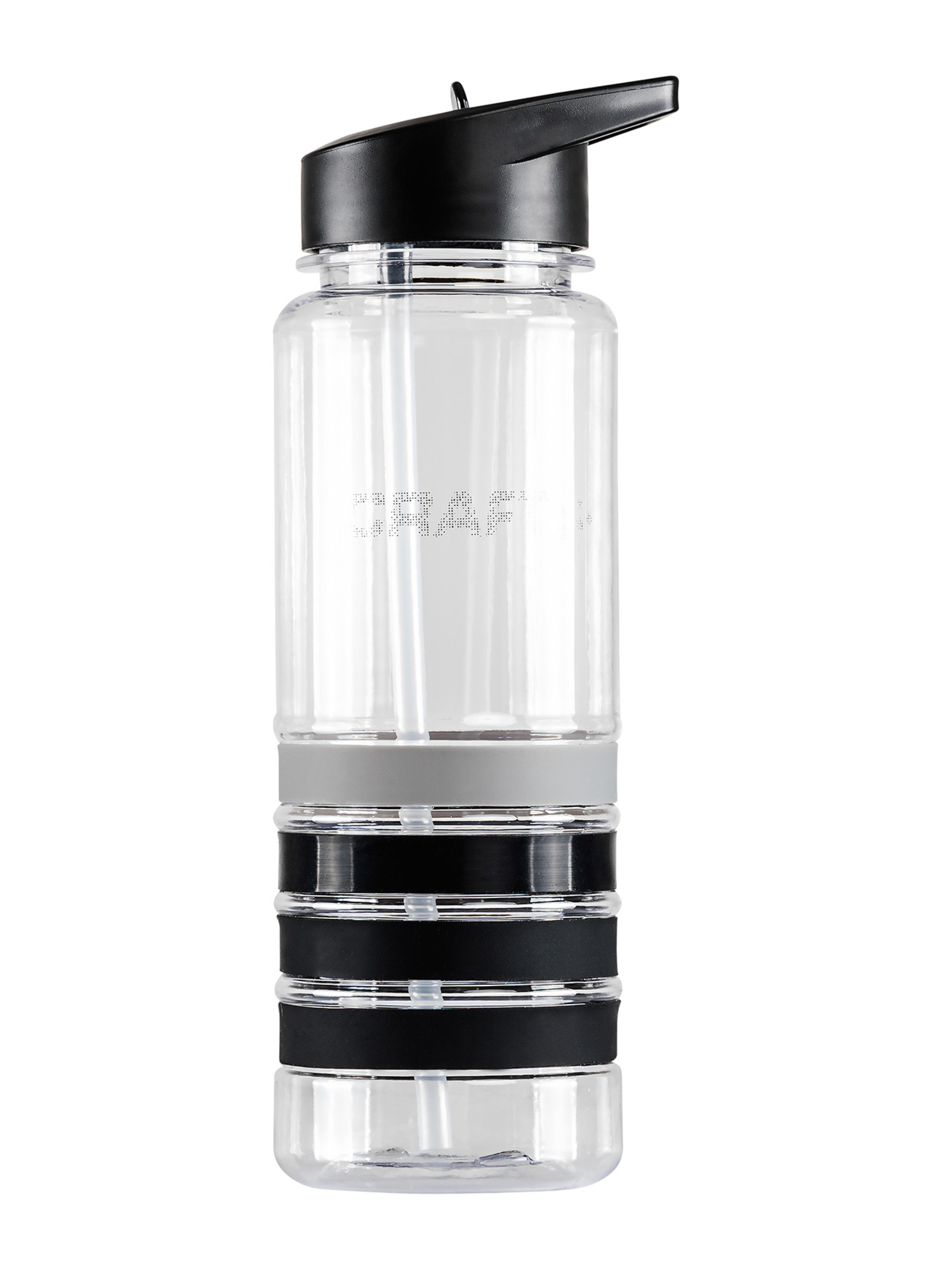 Botella de agua transparente con agarre de goma y tapa abatible diseñada para permitir una hidratación rápida y fácil durante los entrenamientos. Gancho en la parte superior. Composición: 100% Poliamida