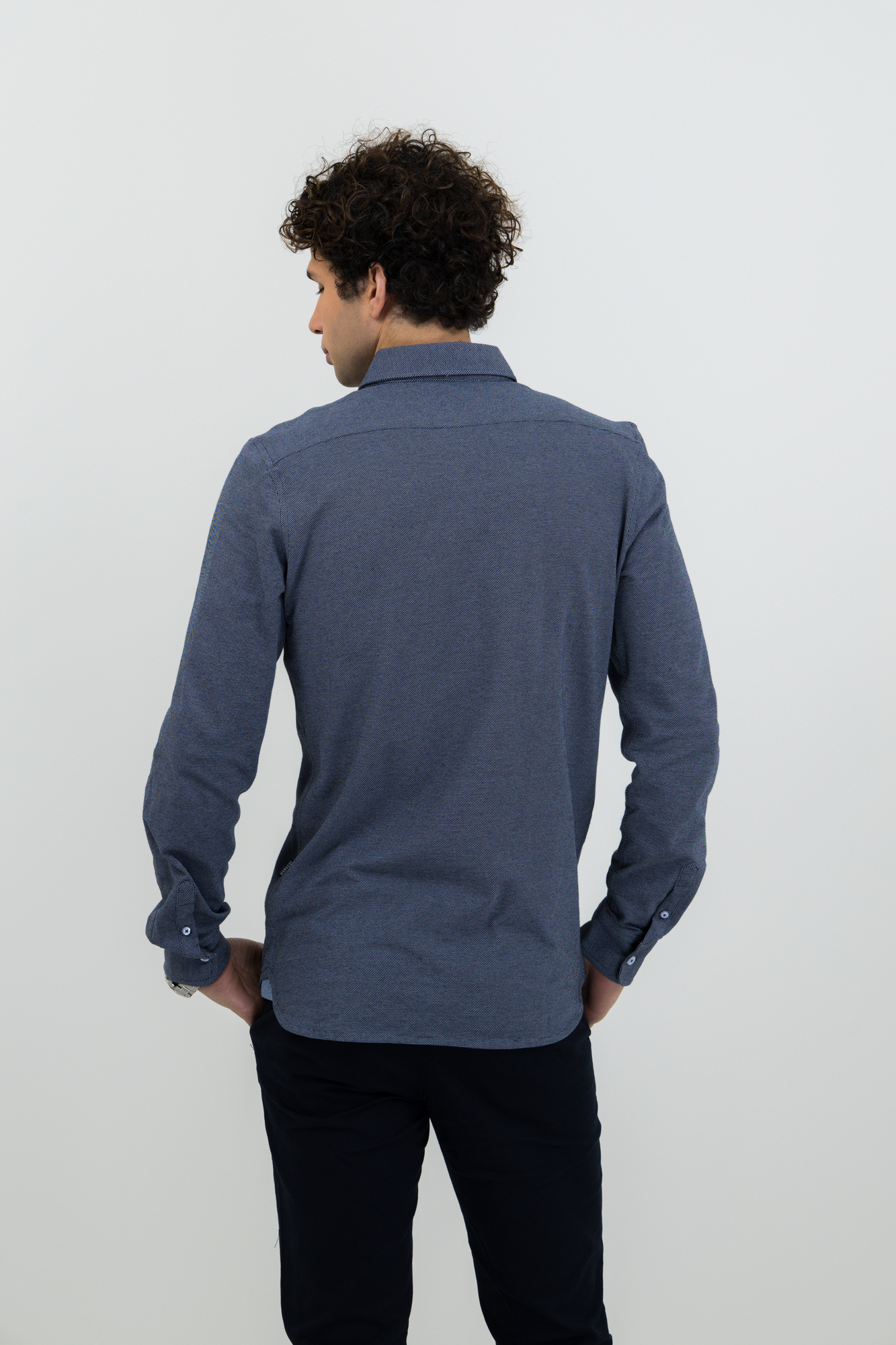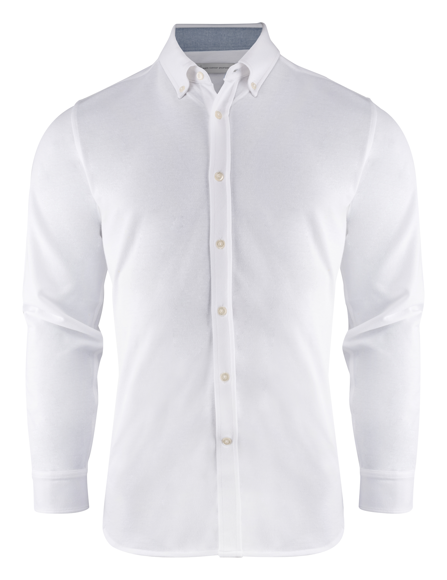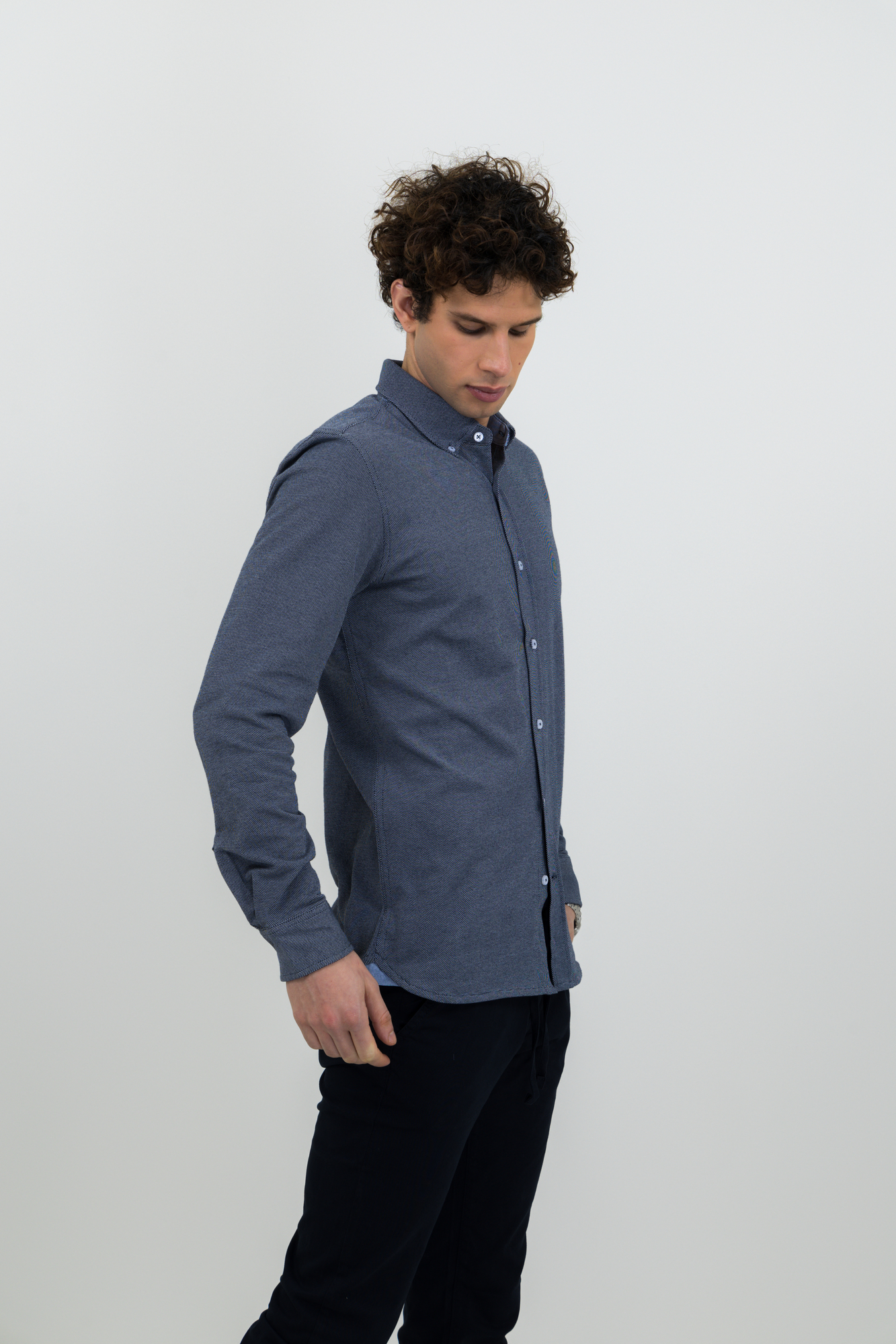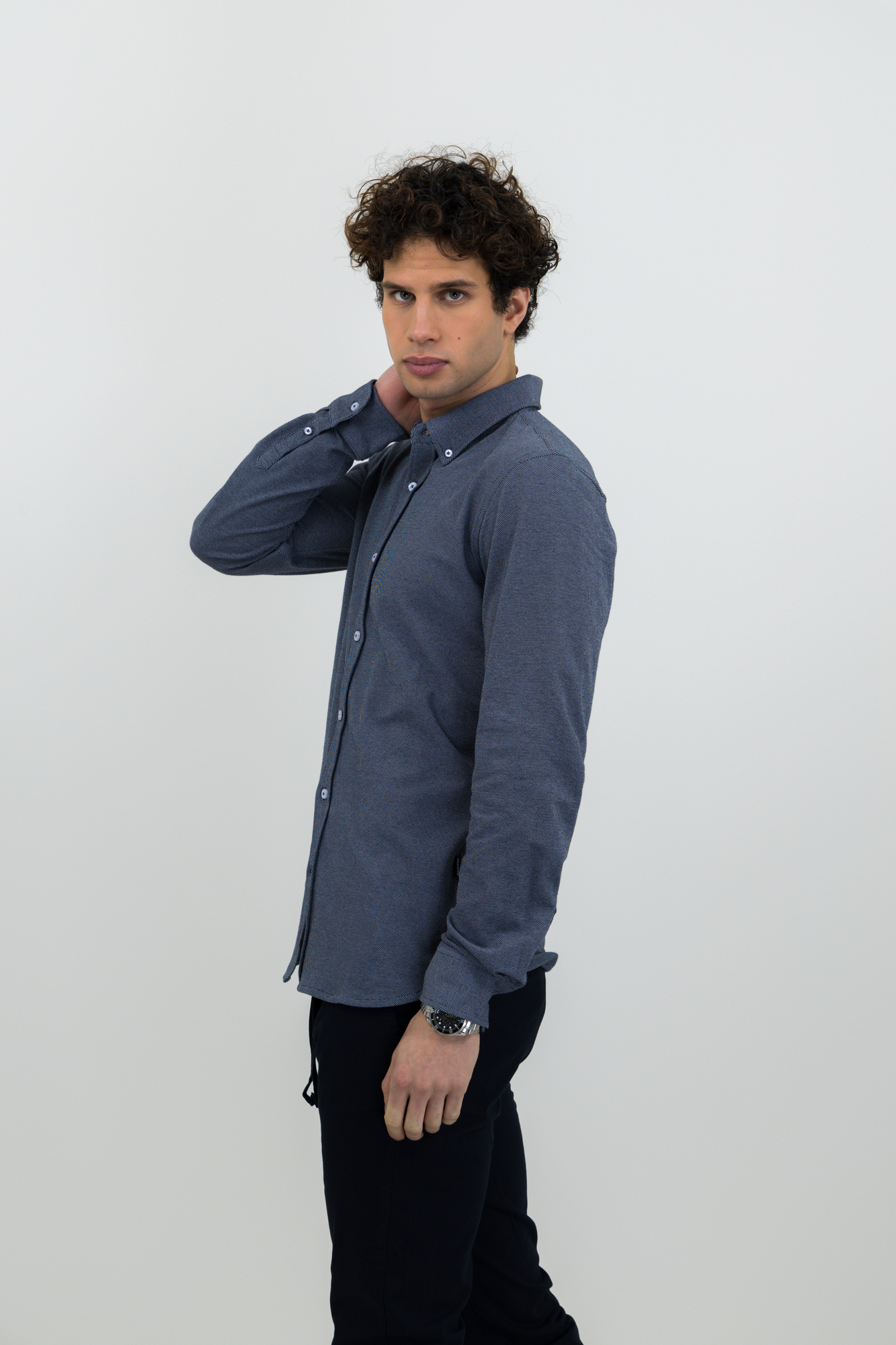 Camisa tejido Jersey con look oxford. Detalles en cuello y aberturas laterales. Botón en cuello en la versión masculina. Botones de color perla. Puños ajustables.