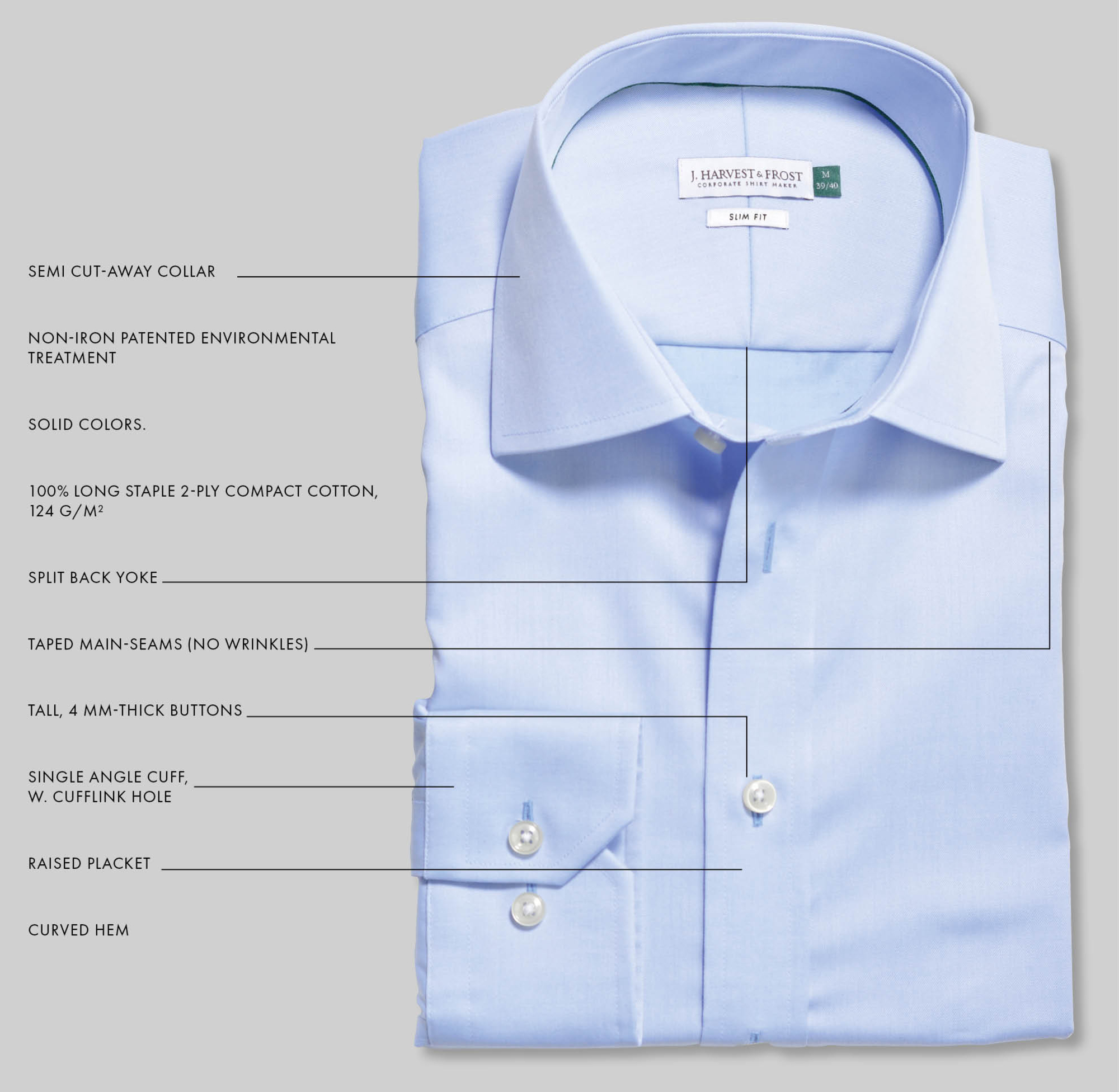 Composición: Colores lisos. 100% Algodón compacto de 2 capas de fibras largas, 124 g/m², tratamiento medioambiental patentado Non-Iron. Costuras principales selladas. Botones de 4 mm de grosor. Manga larga. Puño de ángulo simple, con ojal adicional para gemelos.