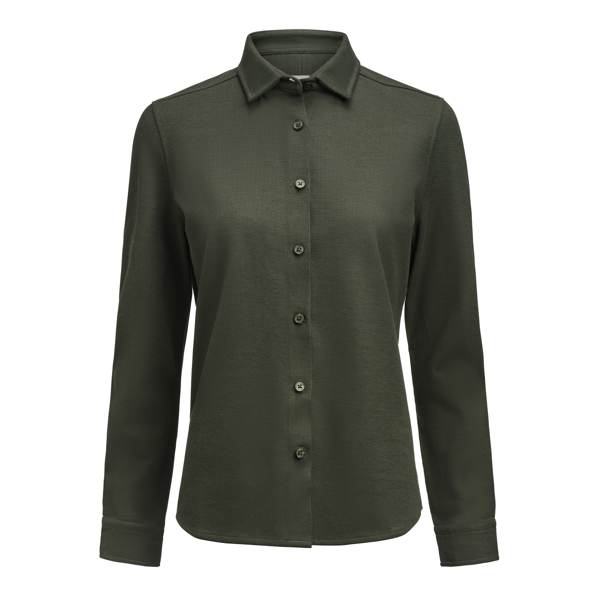 Camisa moderna confeccionada con tejido de punto waffle. Tejido compuesto por algodón orgánico y poliéster reciclado. Esta camisa cuenta con un cuello abotonado oculto y botones tono sobre tono para un look limpio. Disponible en corte entallado para hombre y corte contemporáneo para mujer.