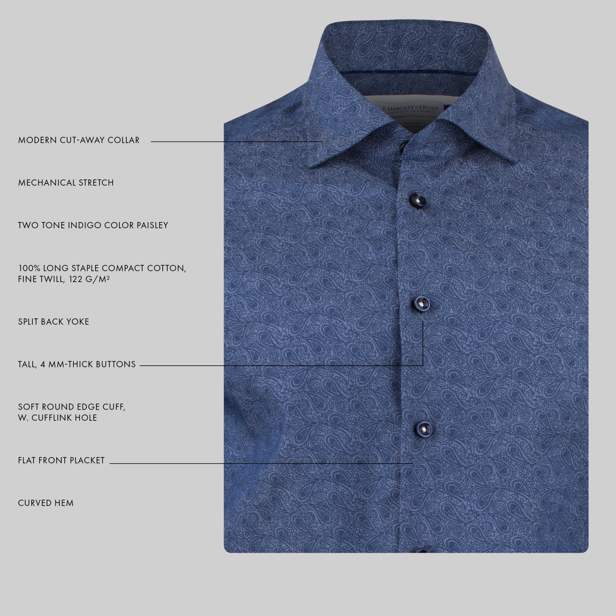 Composición: Sarga fina, paisley de dos tonos de color índigo. 100% algodón, elasticidad natural. Manga larga. Suave puño de borde redondo. Ojal adicional para gemelos. Botones de 4 mm de grosor.