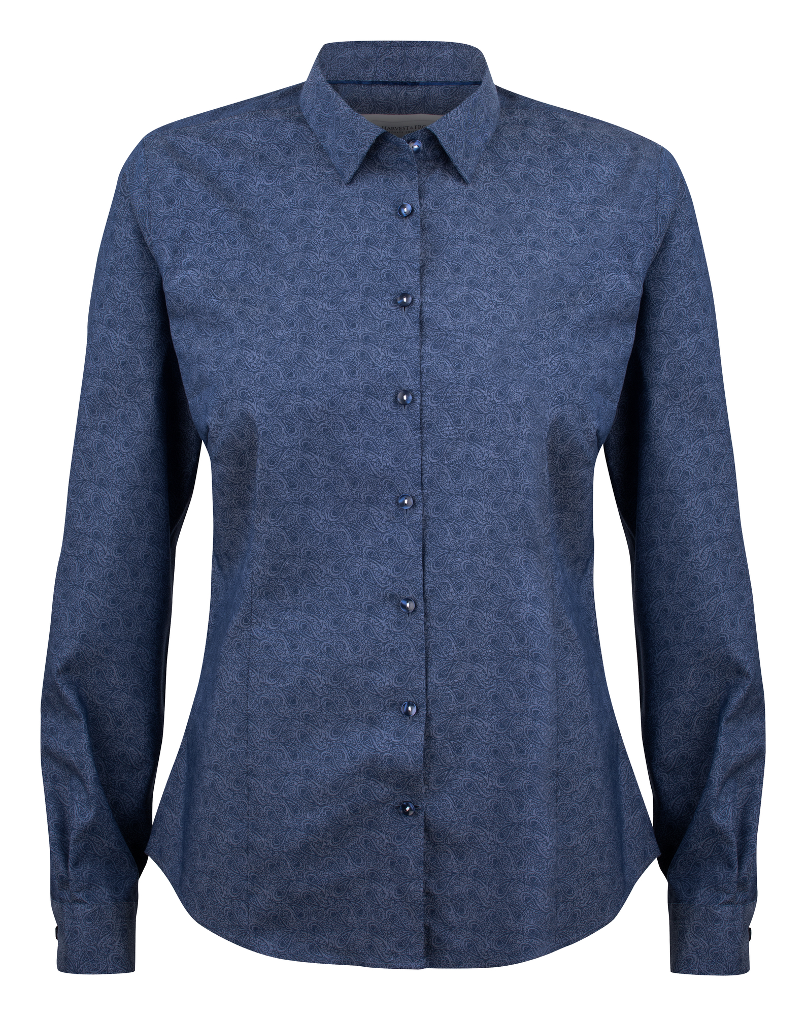 Composición: Sarga fina, paisley de dos tonos de color índigo. 100% algodón, elasticidad natural. Manga larga. Suave puño de borde redondo. Ojal adicional para gemelos. Botones de 4 mm de grosor.