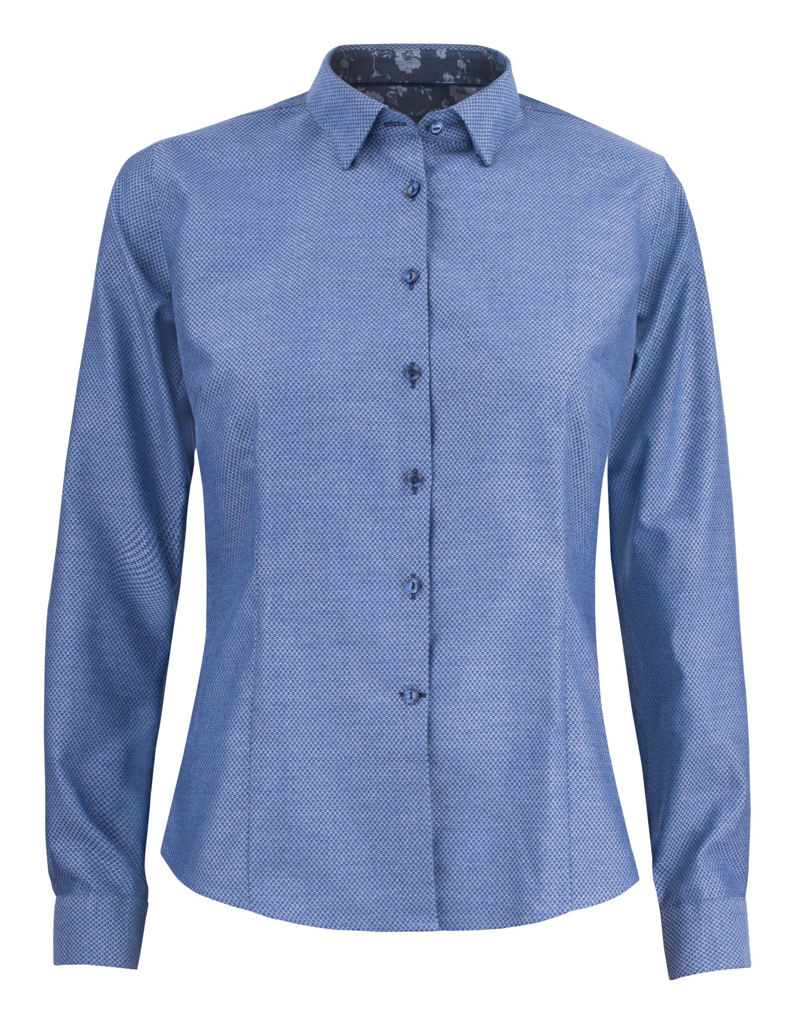 Composición: Estampado jaquard índigo en dos tonos. Superficie cepillada para mayor suavidad. 100% Algodón de fibra larga 125 g/m², elástico mecánico. Non-Iron. Manga larga. Puño suave redondeado con ojal extra para gemelos. Botones de 4 mm de grosor.
