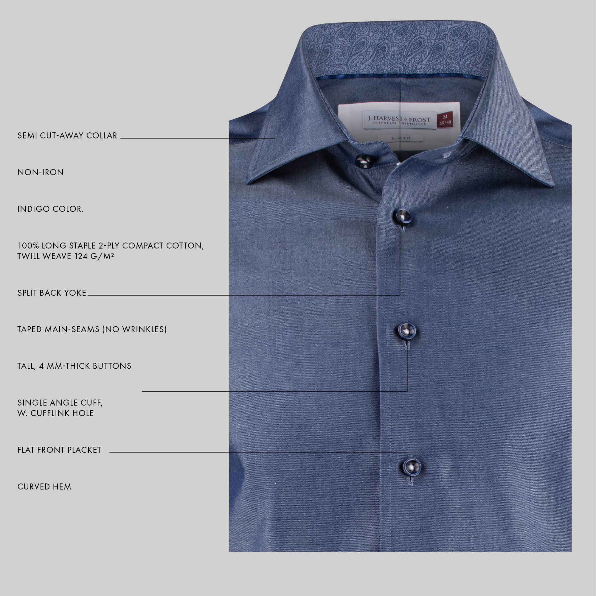 La camisa perfecta para cualquier ocasión. Con el característico color índigo, nuestro famoso tejido de sarga fina sin plancha puede recordarle a una elegante «camisa vaquera». Estampado de cachemir a tono en cuello y puños, Detalles blancos en tapeta y botones.