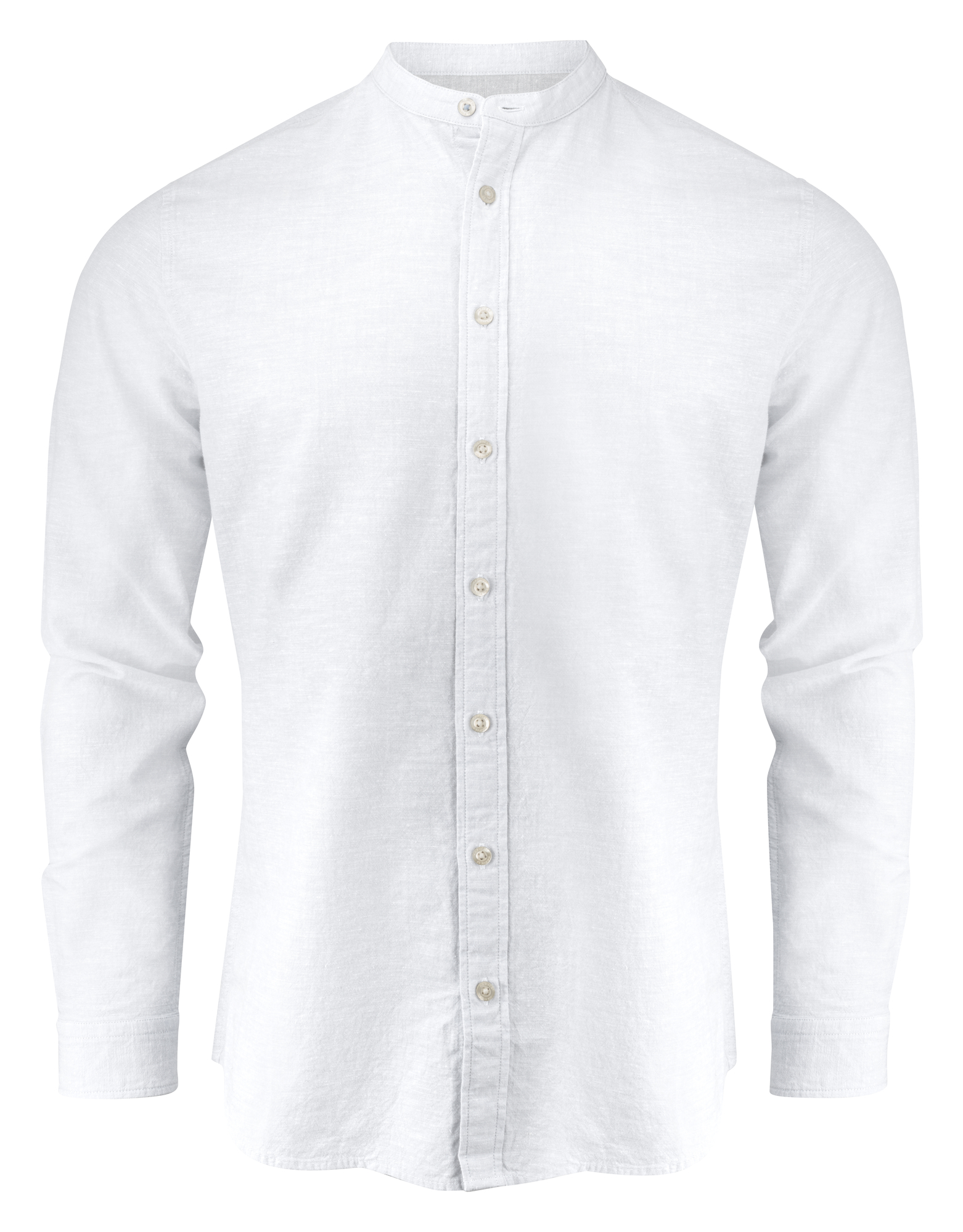Camisa de mezcla con lino, cuello Mao y puños ajustables. Botones color perla. Tejido a contraste en canesú y puños. Hilo previamente teñido.