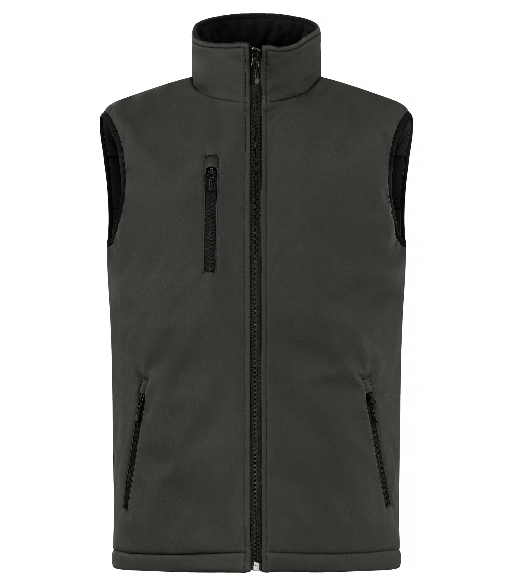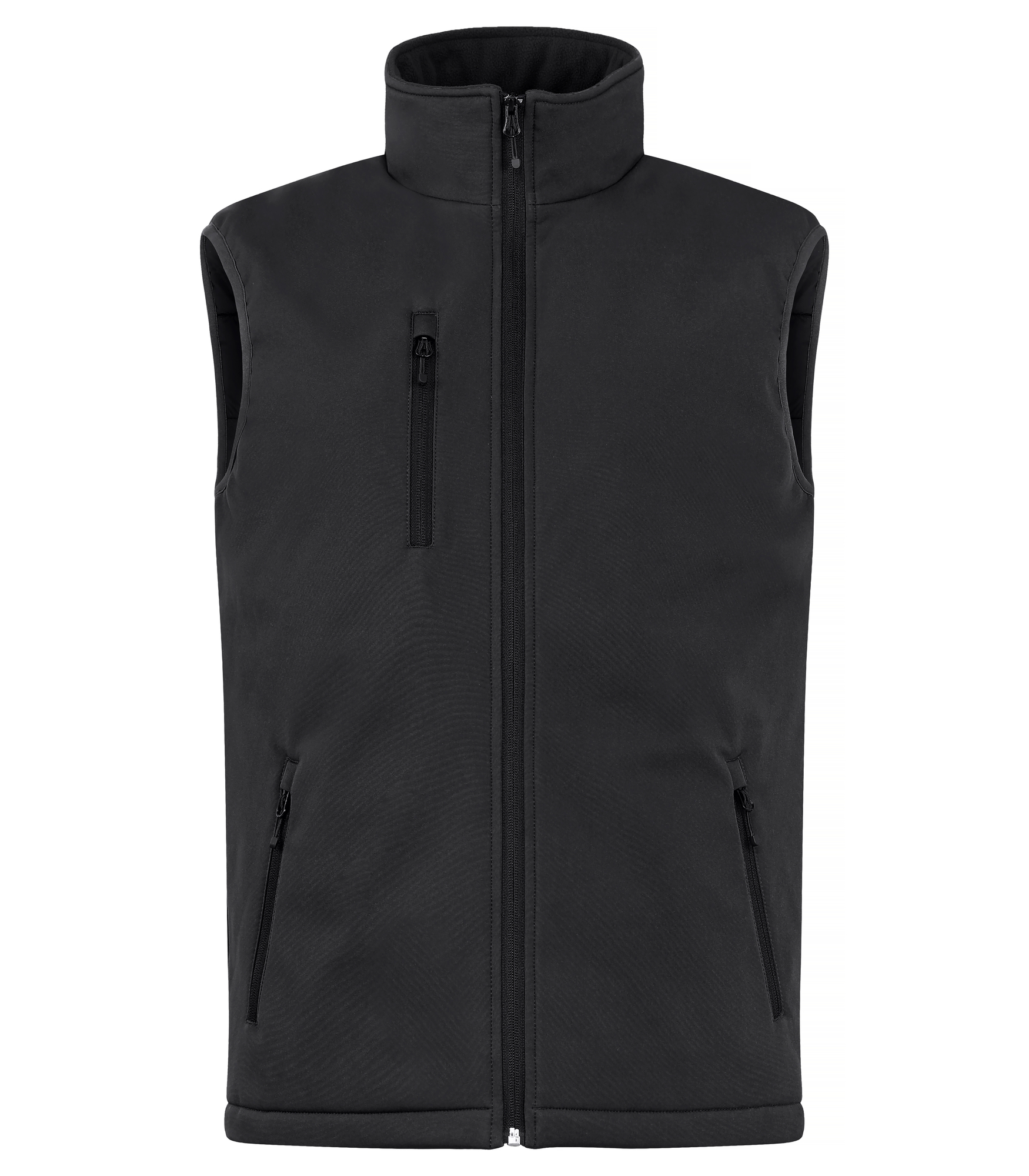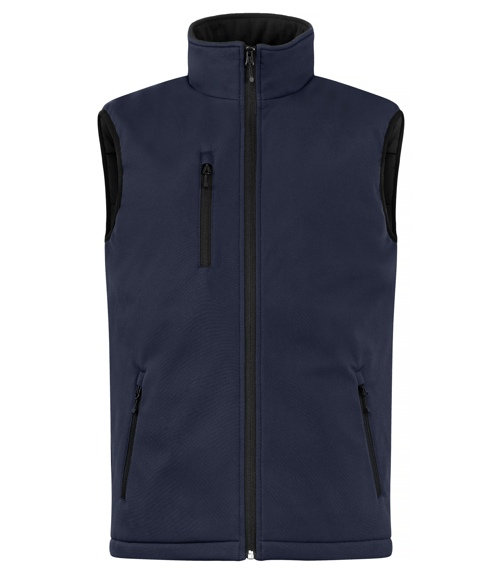 Chaleco softshell acolchado. Tres bolsillos exteriores con cremalleras SBS y un bolsillo interior. Forro de color negro con cremallera para facilitar el marcaje. De fácil re etiquetado.