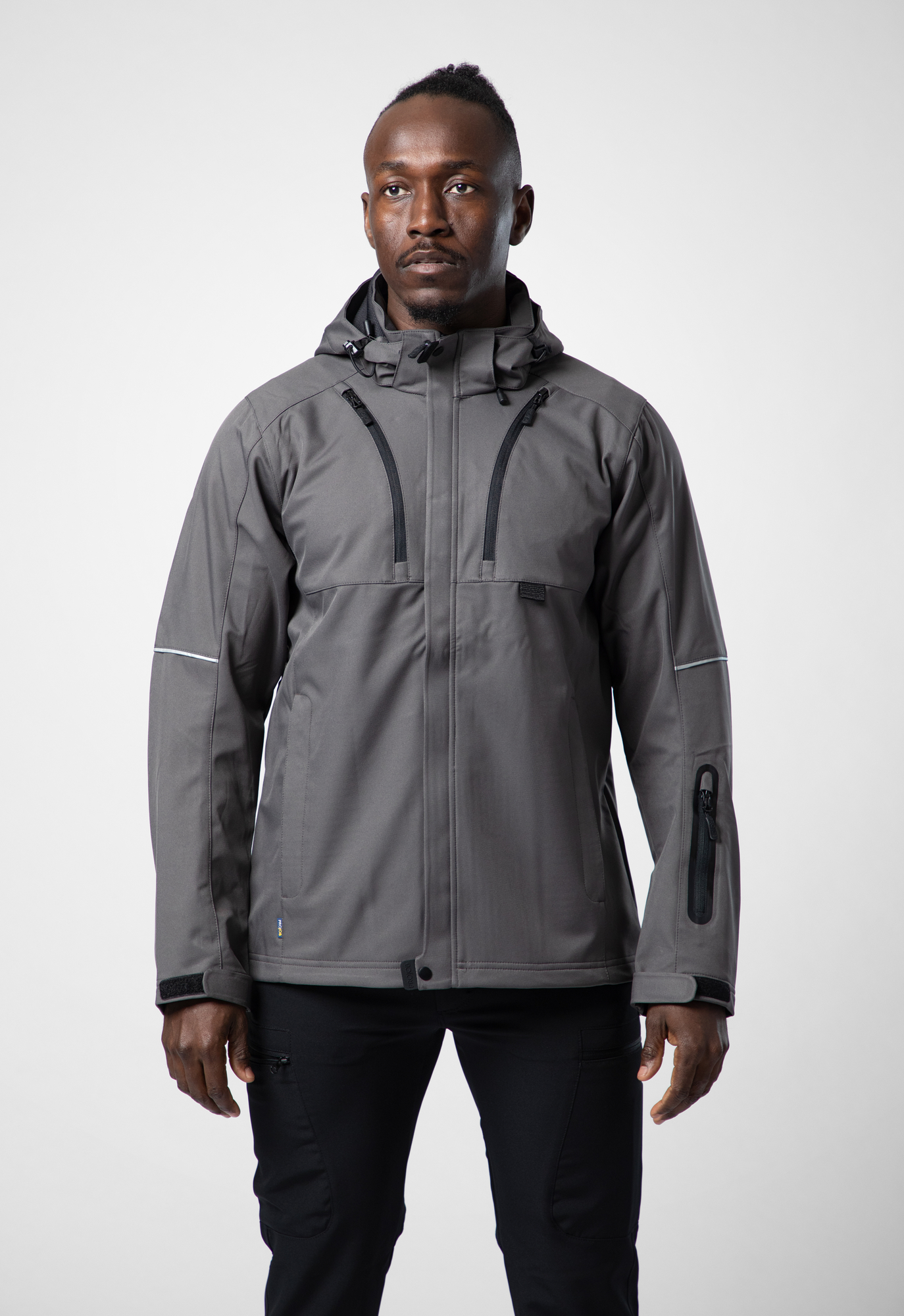 Chaqueta funcional tercera capa, en material softshell repelente al viento y al agua. Forro acolchado y tejido polar en el cuello para mayor calidez y confort. Dos bolsillos en el pecho, el izquierdo con bolsillo interior para móvil y solución para manos libres. Dos bolsillos laterales. Bolsillo en la manga del brazo izquierdo para llaves, tarjetas, etc. Bolsillos interiores en ambos lados, doble bolsillo en el lado izquierdo, uno con cierre de velcro y otro con cremallera. Porta tarjetas de identificación. Cremalleras de ventilación bajo los brazos con malla. Espalda alargada. Ribete reflectante en mangas y espalda. Capucha desmontable, ajustable con cordón. Puños ajustables con velcro y cintura ajustable con cordón. El forro se puede abrir para facilitar el bordado.