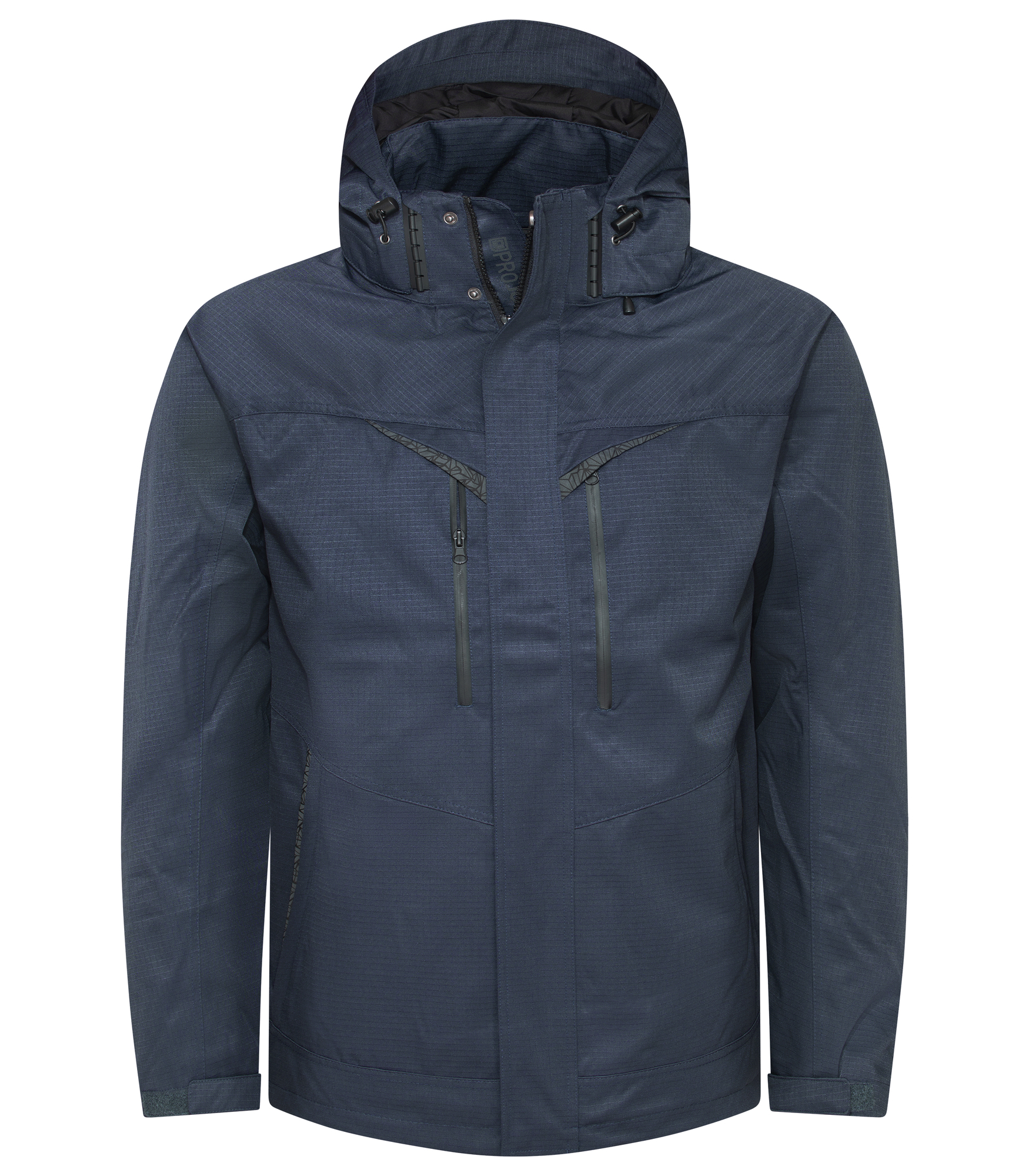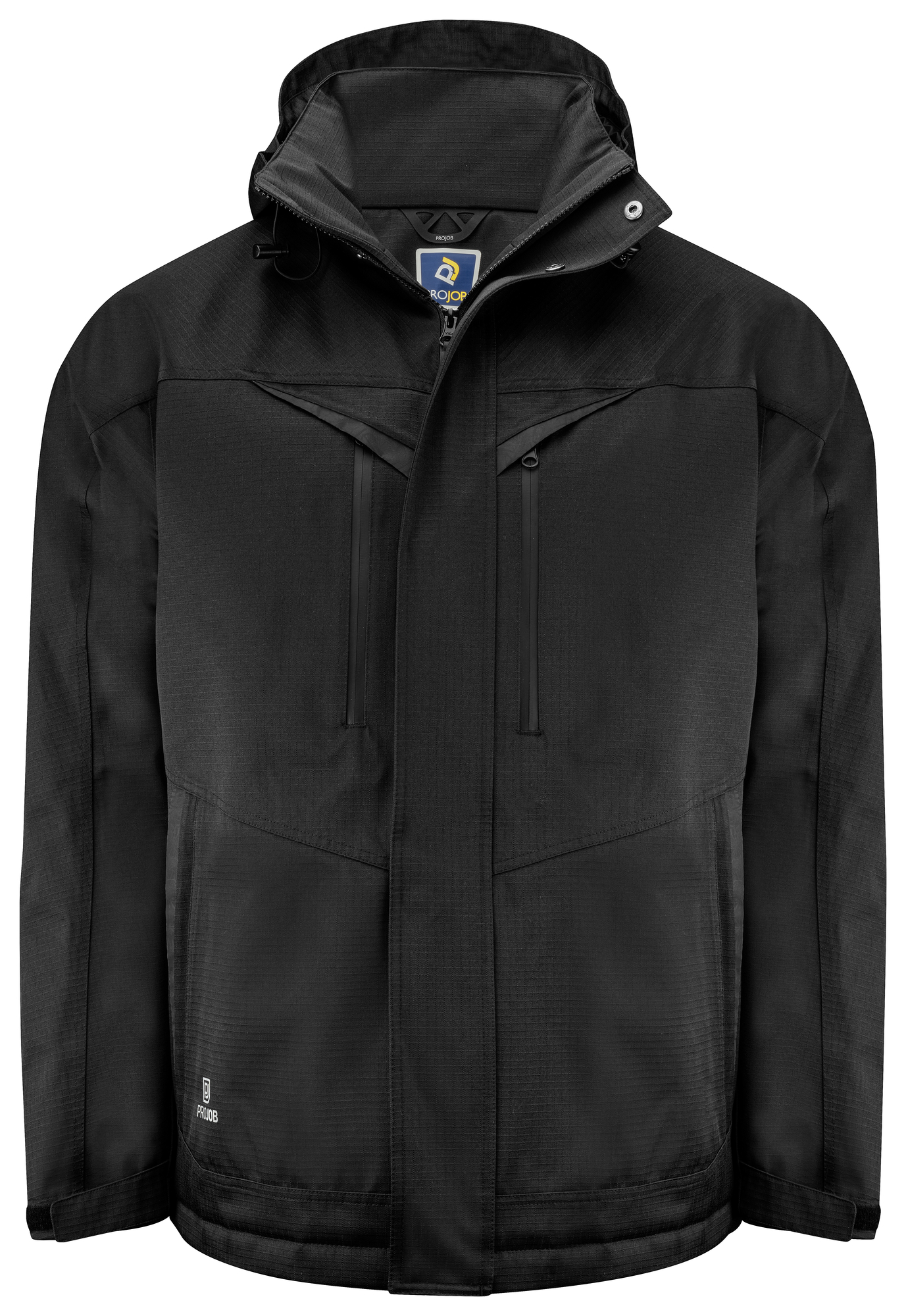 Chaqueta acolchada resistente a viento y agua con costuras selladas, material rip-stop. Cremallera frontal bidireccional con solapa para evitar las corrientes de aire y las filtraciones de agua, cierre con botones a presión. Bolsillos frontales a ambos lados con cremallera, el izquierdo con gancho interno para tarjeta de identificación. Bolsillos laterales con cremallera. Bolsillos interiores en ambos lados con cremallera, en el lado izquierdo un bolsillo abierto con cierre de velcro. Capucha desmontable, ajustable en dos sentidos con cordón. Puños ajustables con velcro, también con agarre interno para el pulgar. Cintura ajustable con cordón. El forro se puede abrir para facilitar la impresión.
