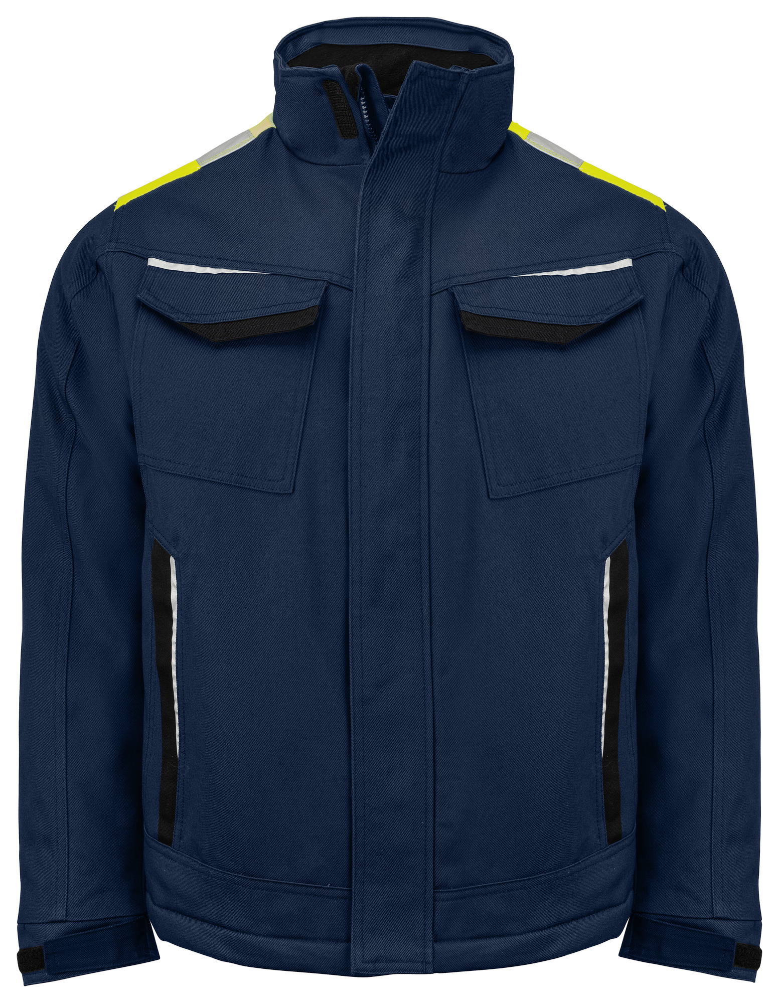 Chaqueta con cremallera hasta el cuello en la parte delantera, con solapa cortaviento interna y protector de barbilla para evitar corrientes de aire y rozaduras. Bolsillos frontales a ambos lados, en el lado izquierdo gancho interno para tarjeta de identificación. Bolsillos laterales con cremalleras. Amplios bolsillos interiores, bolsillo para el móvil con cierre de velcro. Espalda prolongada. Puños ajustables con velcro. Tejido fluorescente y reflectante sobre los hombros, también ribetes reflectantes en la espalda y en los bolsillos delanteros para mayor visibilidad. El forro se puede abrir para facilitar la impresión y el bordado.