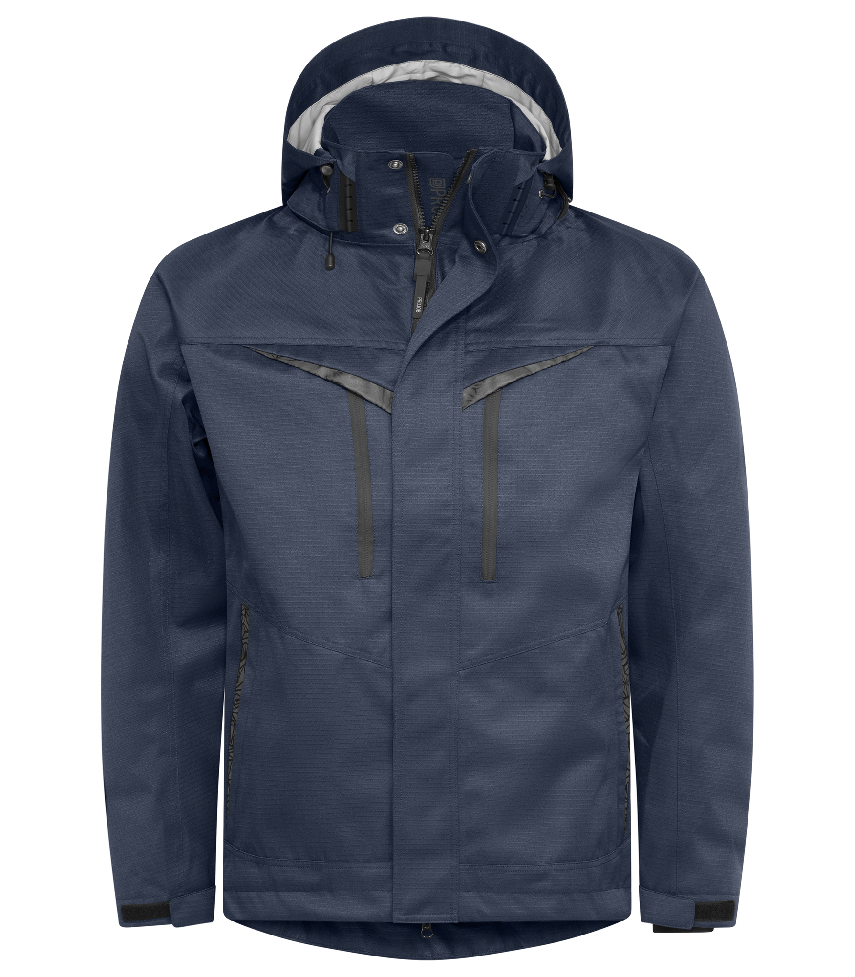 Cazadora cortaviento e impermeable con costuras selladas, confeccionada en material rip-stop. Cremallera bidireccional en la parte delantera con solapa para evitar corrientes de aire y filtraciones de agua, cierre con botones automáticos. Bolsillos de pecho a ambos lados con cremallera, el izquierdo con soporte interno para tarjeta de identificación. Bolsillos laterales con cremallera. Bolsillos interiores en ambos lados con cremallera, en el lado izquierdo un bolsillo abierto con cierre de velcro. Capucha desmontable, ajustable en dos sentidos con cordón. Puños ajustables con velcro, también con agarre interno para el pulgar. Dobladillo de la chaqueta ajustable con cordón. El forro se puede abrir para facilitar la impresión.