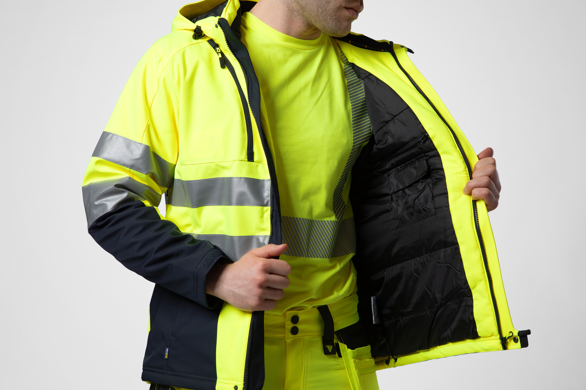 Chaqueta funcional tercera capa, en material softshell repelente al viento y al agua. Dos bolsillos en el pecho, el izquierdo con bolsillo interior para móvil y solución para manos libres. Dos bolsillos laterales. Bolsillo en la manga del brazo izquierdo para llaves, tarjetas, etc. Bolsillos interiores en ambos lados, doble bolsillo en el lado izquierdo, uno con cierre de velcro y otro con cremallera. Porta tarjetas de identificación. Cremalleras de ventilación bajo los brazos con malla. Espalda alargada. Capucha desmontable, ajustable con cordón. Cuello forrado de forro polar para mayor comodidad. Puños ajustables con velcro y cintura ajustable con cordón.