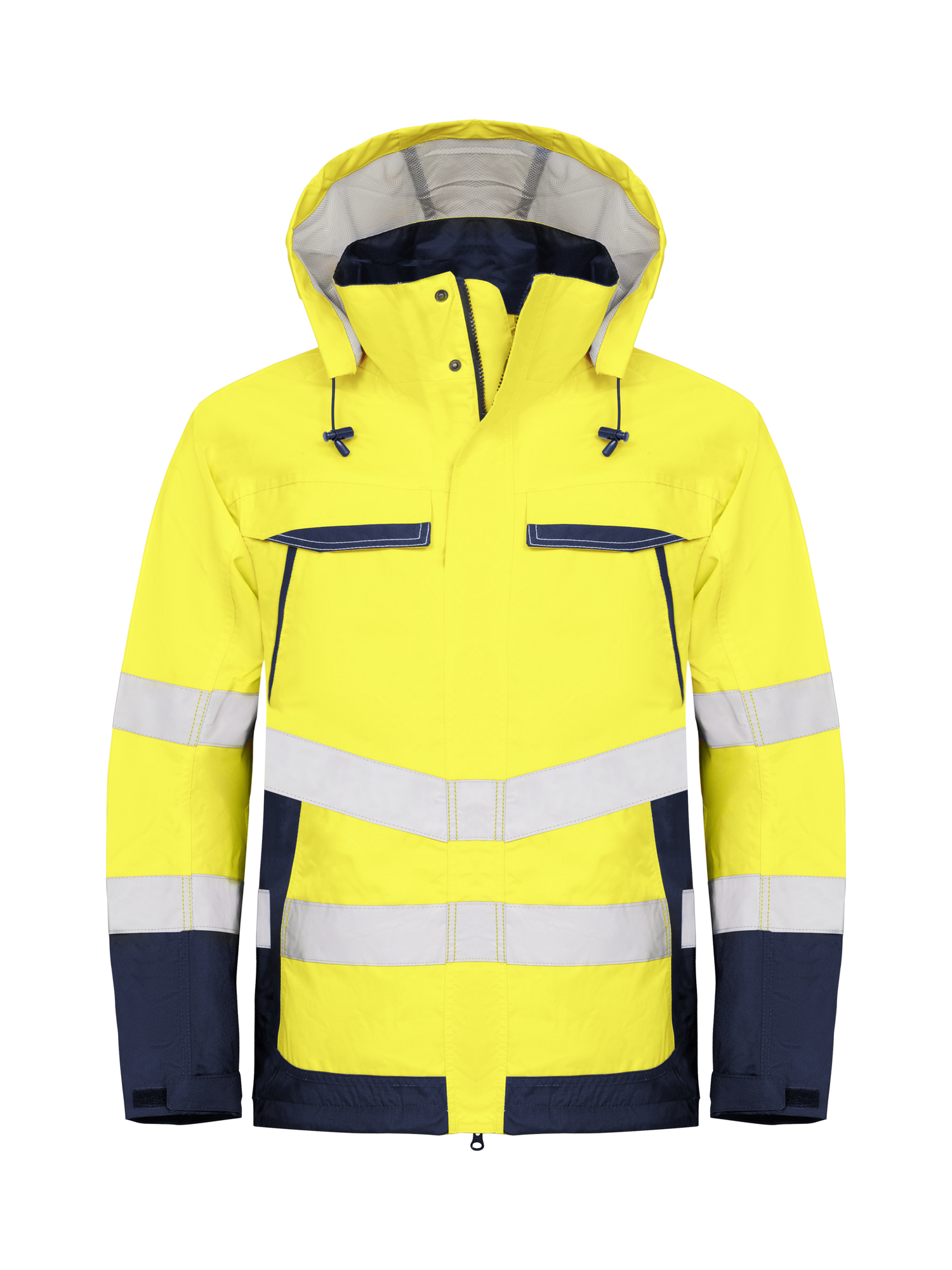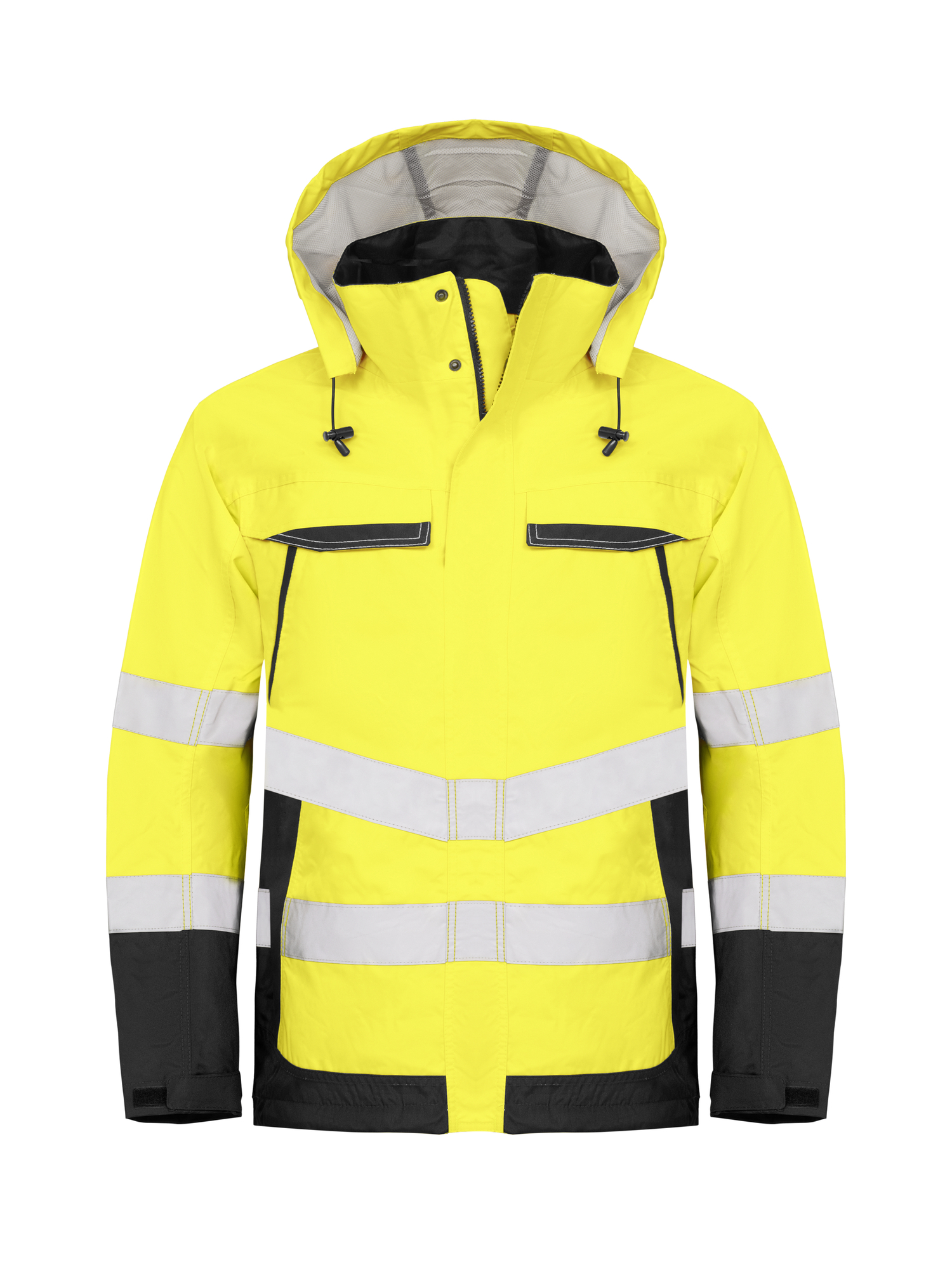 Chaqueta cortaviento e impermeable con costuras selladas. Cremallera bidireccional en la parte delantera con solapa para evitar las corrientes de aire y las filtraciones de agua, cierre con botones automáticos. Bolsillos dobles en el pecho, dos con solapa y cierre de velcro y dos con cremalleras impermeables. Gancho para tarjeta de identificación en el lado izquierdo. Bolsillos laterales con cremallera y forro polar. Tres amplios bolsillos interiores, dos de ellos con cremallera. Capucha ajustable con cordón, desmontable. Puños ajustables con velcro y cintura ajustable con cordón. El forro se puede abrir para facilitar la impresión.