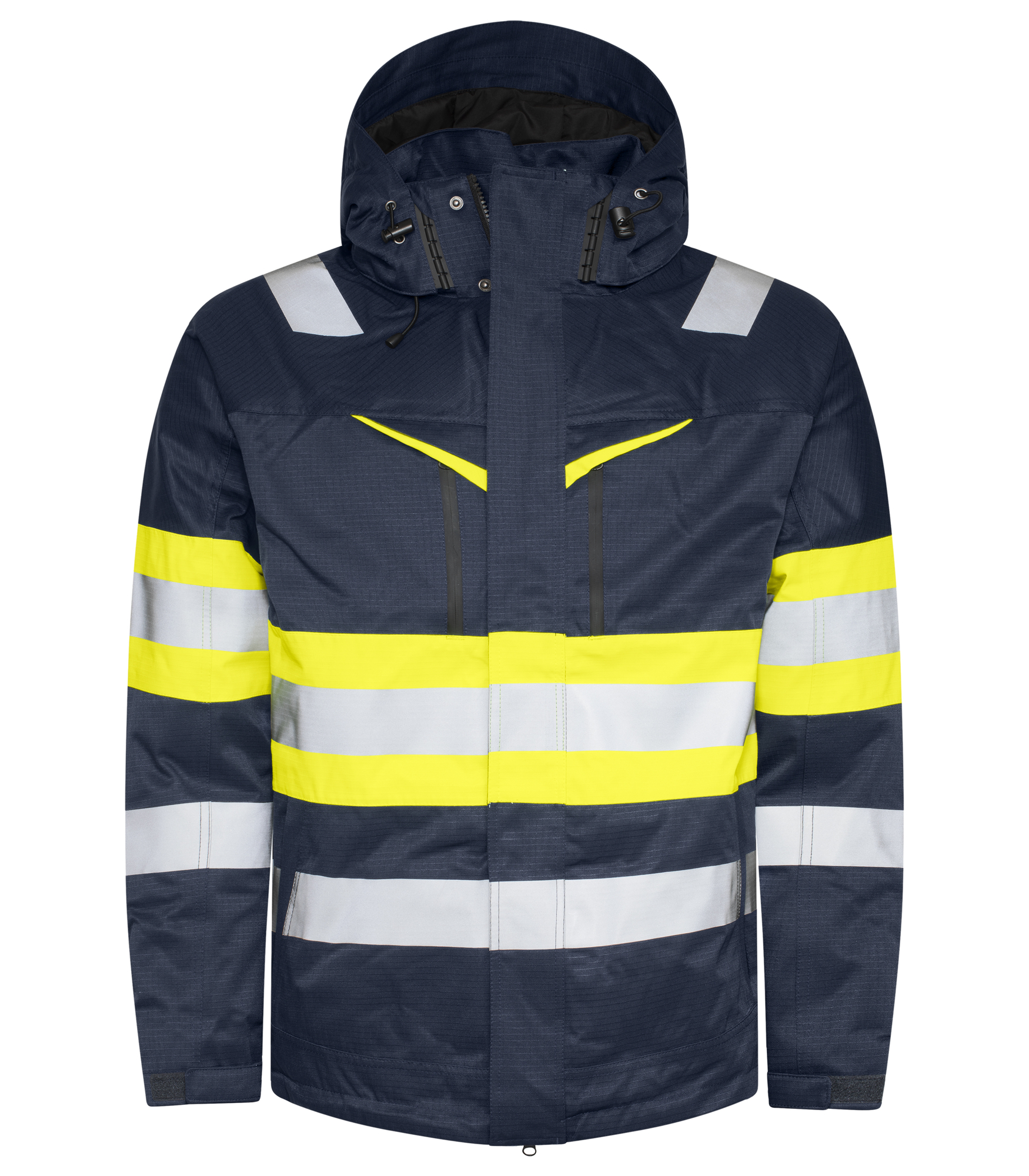 Chaqueta acolchada resistente a viento y agua con costuras selladas, material rip-stop. Cremallera frontal bidireccional con solapa para evitar las corrientes de aire y las filtraciones de agua, cierre con botones de presión. Bolsillos frontales a ambos lados con cremallera, el izquierdo con gancho interno para tarjeta de identificación. Bolsillos laterales con cremallera. Bolsillos interiores en ambos lados con cremallera, en el lado izquierdo un bolsillo abierto con cierre de velcro. Capucha desmontable y ajustable en dos sentidos con cordón. Puños ajustables con velcro, también con agarre interno para el pulgar. Cintura ajustable con cordón. El forro se puede abrir para facilitar la impresión.