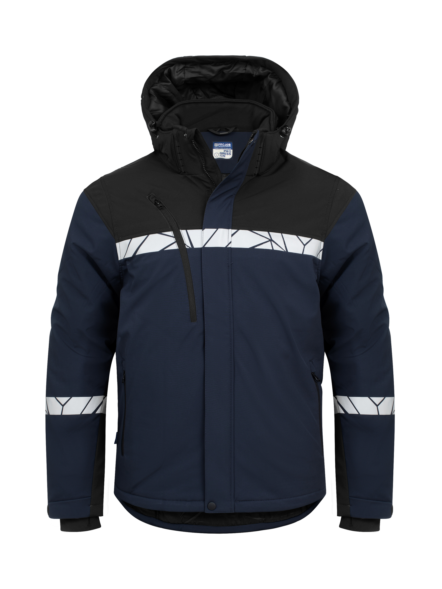 Chaqueta softshell acolchada en material repelente al viento y al agua, cremallera frontal cubierta con solapa para evitar corrientes de aire y filtraciones de agua. Bolsillo en el pecho en el lado derecho con soporte interno para sujetar la tarjeta de identificación, también bolsillos laterales en ambos lados con cierre de cremallera, forrados con forro polar. Bolsillos interiores a ambos lados con cierre de velcro. Espalda alargada. Capucha desmontable, ajustable con cordón. Puños ajustables con velcro, también un puño interior extra para evitar el frío. Cintura ajustable con cordón. Bolsillo para chip de lavandería en la costura lateral izquierda interior.