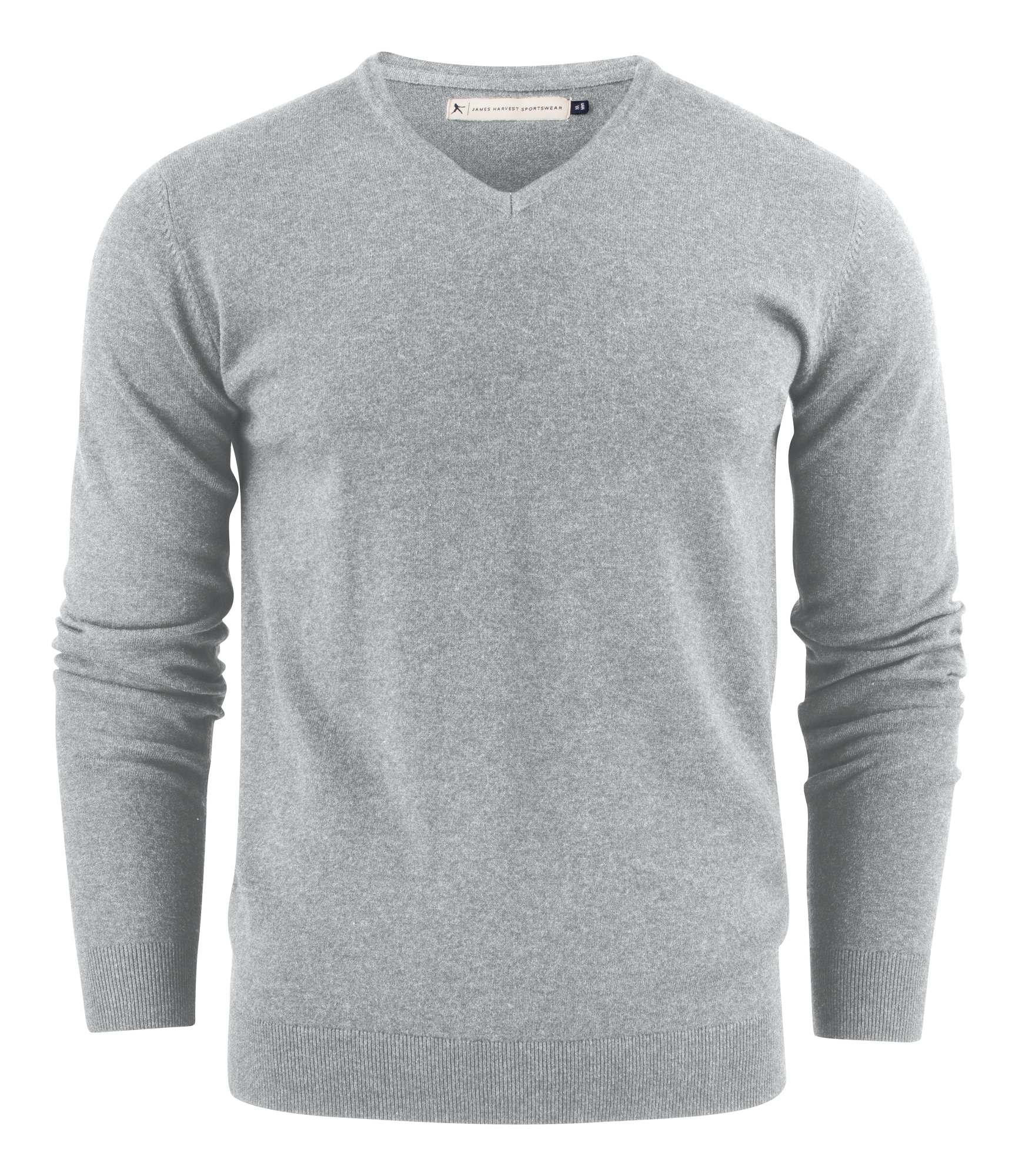 Suéter de punto con cuello en V, canalé 1×1 en dobladillo y mangas.