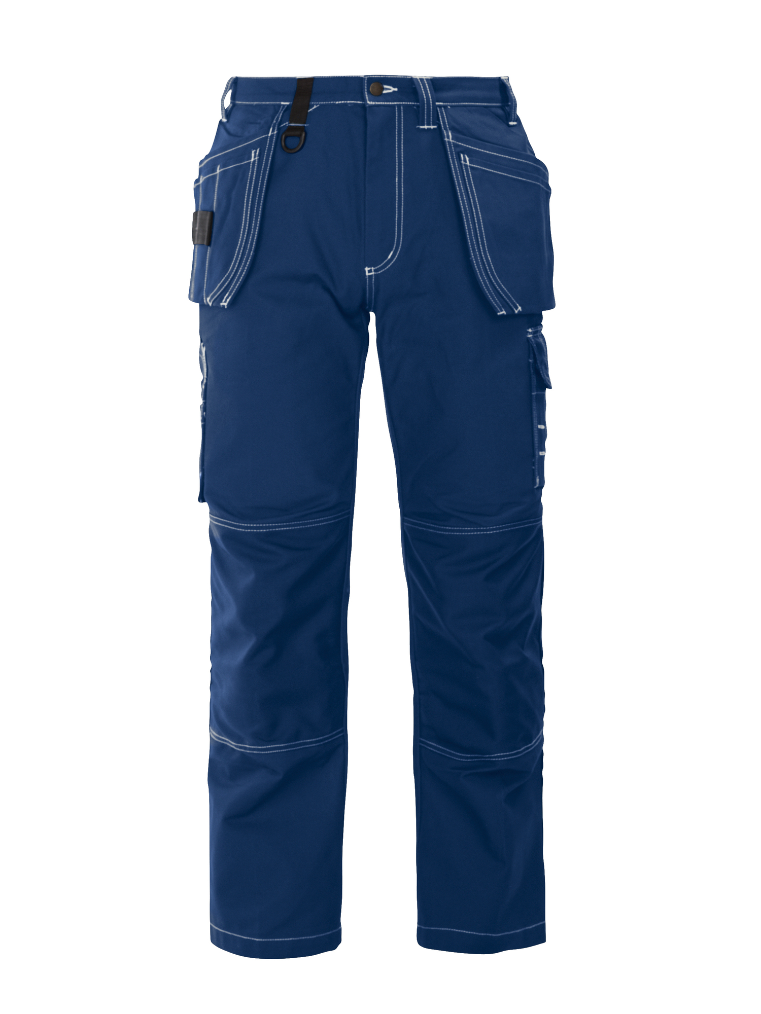 Pantalones de algodón y refuerzos de Cordura®. Bolsillos laterales en ambos lados, uno con bolsillos adicionales y otro con presillas para herramientas. Bolsillos en las piernas, en el lado izquierdo bolsillo con solapa y cierre de botón a presión, bolsillo interior para móvil y gancho para tarjeta de identificación. En el lado derecho bolsillo para cinta métrica y bolsillo con botón para herramientas. Bolsillos traseros con anchura extra. Dos trabillas ajustables para martillo, una a cada lado. D- Ring en cintura. Bolsillos interiores para protectores de rodilla, ajustables a dos niveles de altura. Los bolsillos para fundas, la parte posterior de los dobladillos de las piernas y las rodillas están reforzados con Cordura® para una mayor durabilidad.