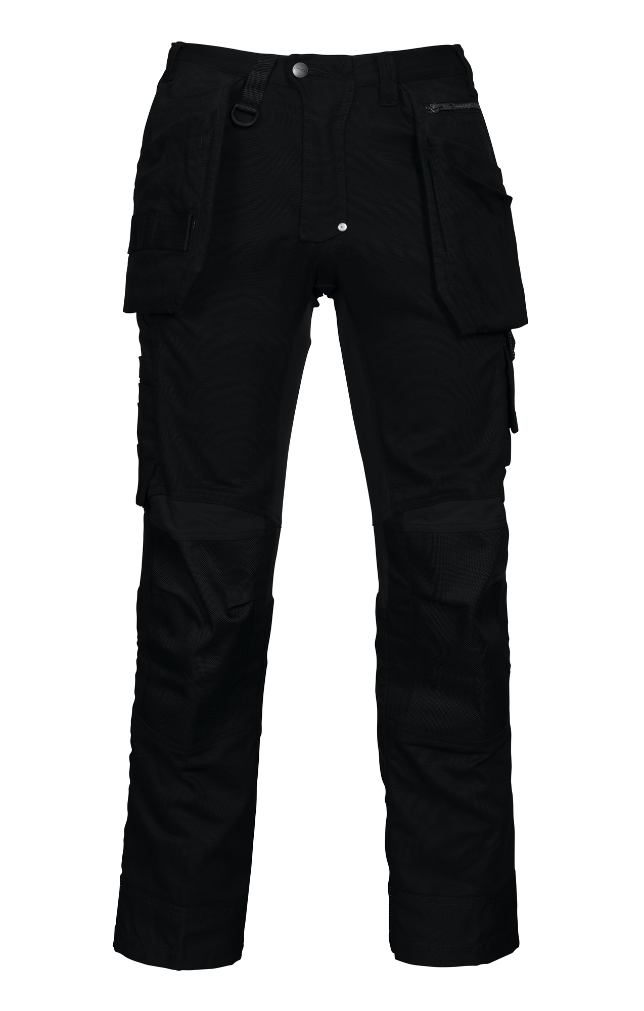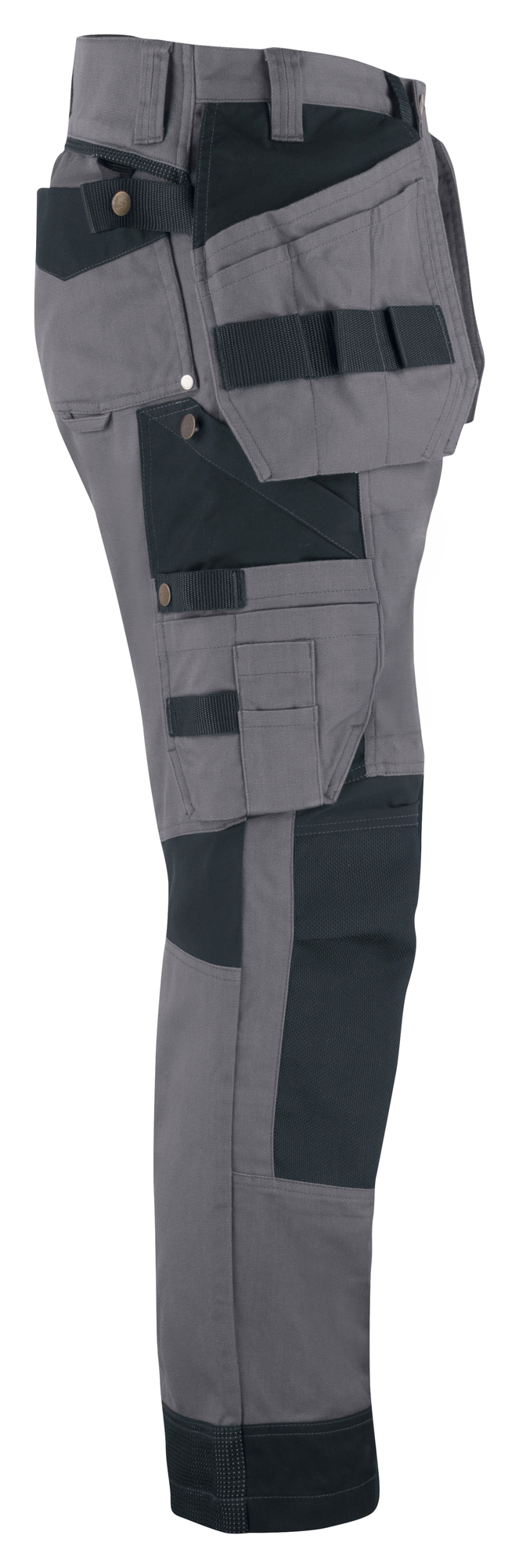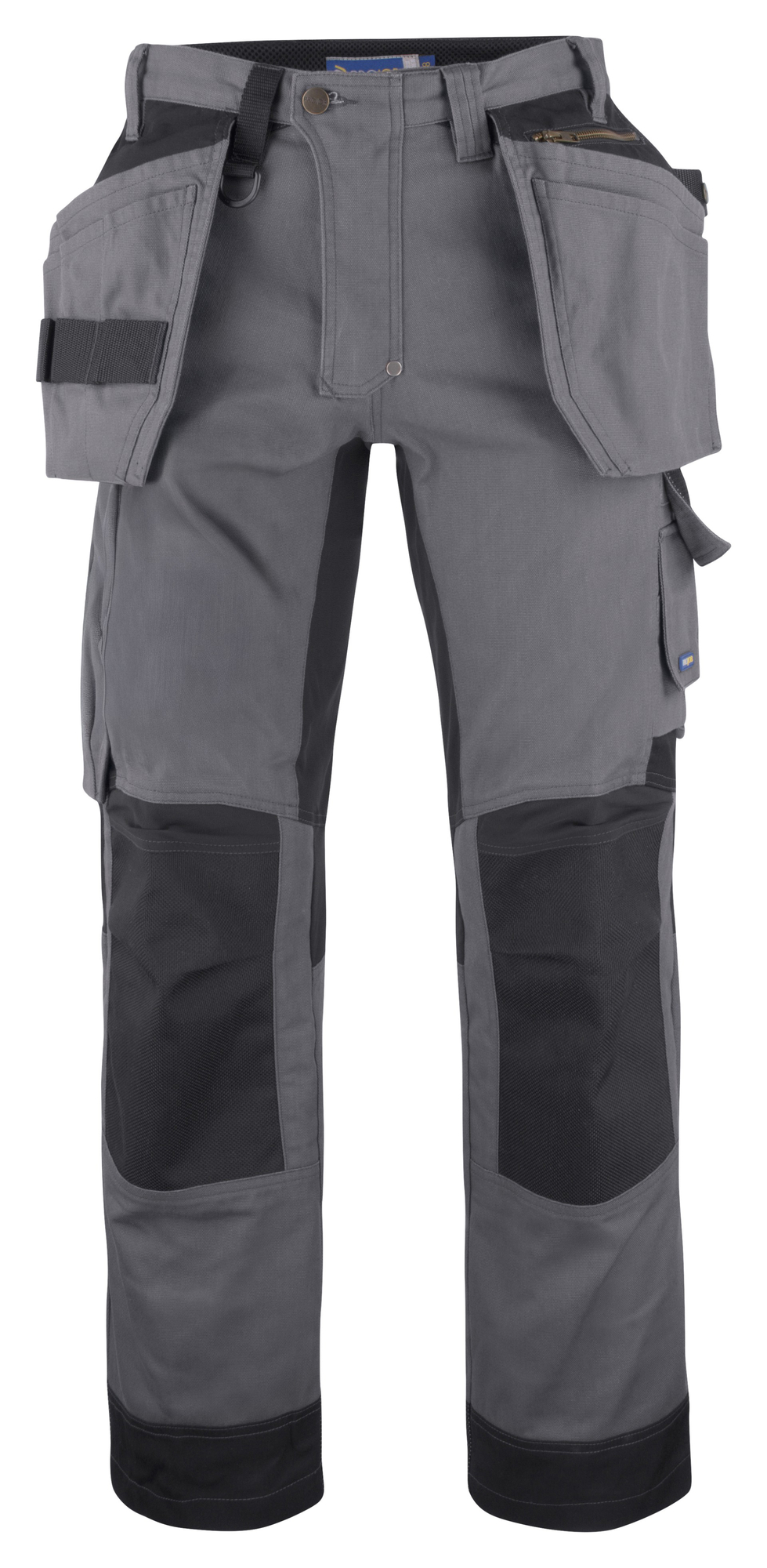 antalón con canesú acolchado ergonómico en la espalda para un confort óptimo. Tejido elástico en la entrepierna para mayor comodidad. Bolsillos colgantes que se pueden guardar en los bolsillos laterales, con compartimentos adicionales y refuerzos internos de Cordura®. Bolsillos en la pierna, en el lado izquierdo bolsillo con solapa y cierre de botón a presión, bolsillo interno para móvil y gancho para tarjeta de identificación. En el lado derecho bolsillo para cinta métrica y bolsillo con botón para herramientas. Bolsillos traseros con anchura extra, solapa en el izquierdo. Dos trabillas ajustables para martillo. D-Ring en cintura. Rodillas precurvadas con refuerzos de Kevlar. Bolsillos internos para protectores de rodilla, ajustables a dos niveles de altura. Detalles reflectantes de Cordura®. Los bolsillos para fundas, la parte trasera de los dobladillos de las piernas y las rodillas están reforzados con Cordura® para una mayor durabilidad.