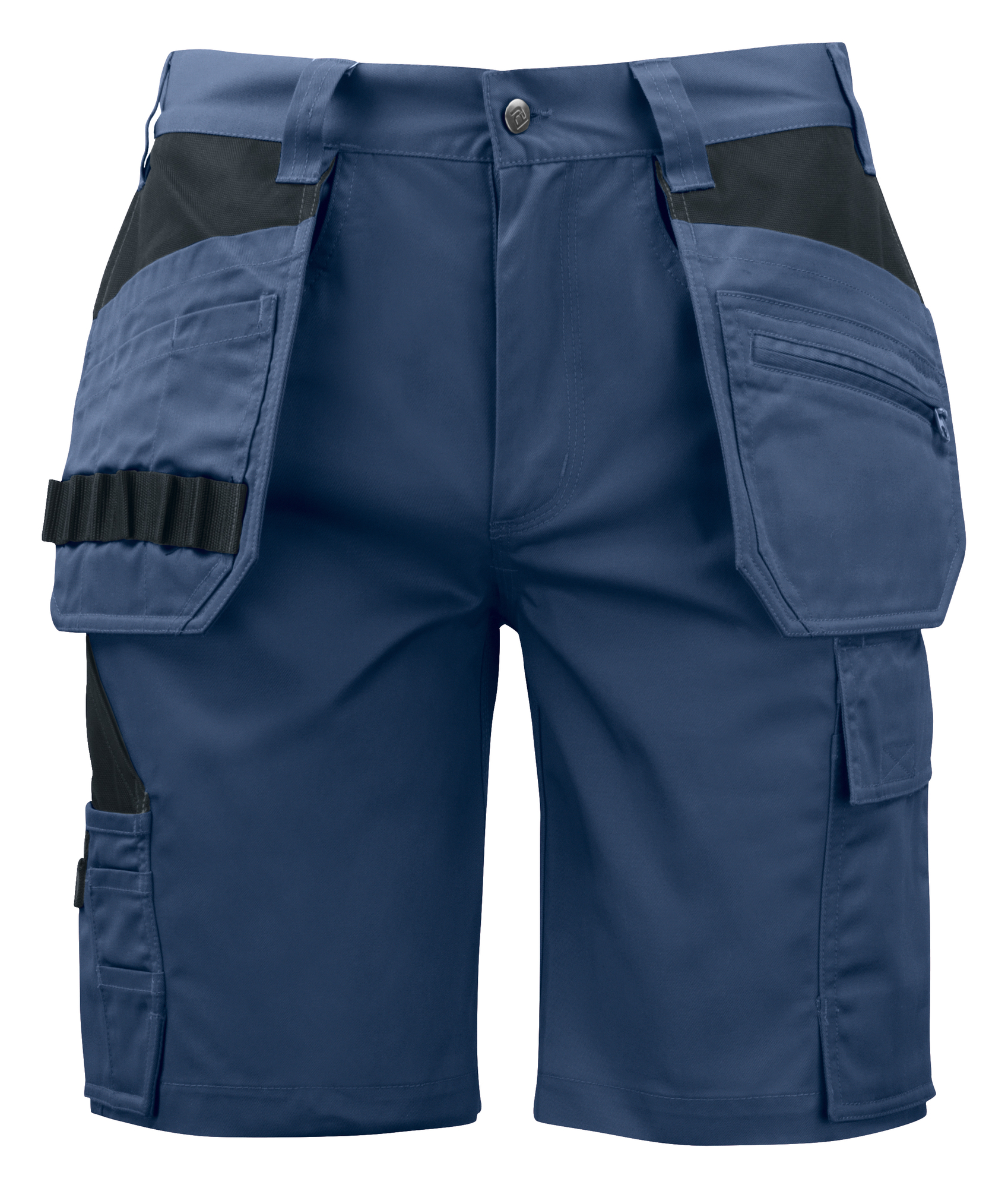 Pantalones cortos con bolsillos tipo funda que se pueden guardar en los bolsillos laterales, uno con un bolsillo adicional y otro con trabillas para herramientas. Bolsillos traseros con solapa y cierre de velcro. Bolsillo para cinta métrica y bolsillo con botón para herramientas. Dos trabillas para martillos, una a cada lado. Refuerzo en el interior del bolsillo para cinta métrica y en el interior de los bolsillos tipo funda.