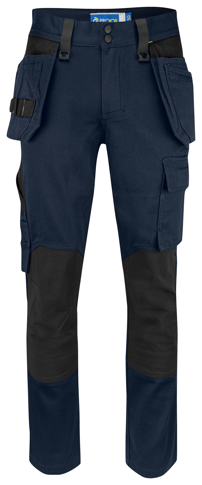 Pantalón de algodón resistente con tejido elástico Cordura® en la parte trasera y entrepierna para proporcionar una mayor libertad de movimientos. Bolsillos tipo funda con compartimentos adicionales y refuerzo interno de Cordura®; si se desea, se pueden quitar los bolsillos tipo funda descosiendo la costura a contraste de la parte trasera. Amplios bolsillos a ambos lados de la pierna. Bolsillo en la pierna izquierda para herramientas y bolígrafos, bolsillo para móvil con cierre magnético y gancho para sujetar la tarjeta identificativa. En el lado derecho bolsillo para cinta métrica y bolsillo con botón para herramientas. Rodillas precurvadas. Bolsillos internos para protectores de rodilla, ajustables a dos niveles de altura.
