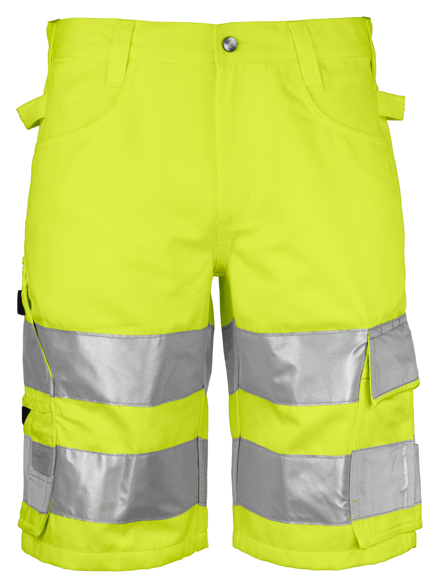 Pantalón corto con bolsillos laterales. Bolsillos traseros con solapa y cierre de velcro. Bolsillos en la pierna, en el lado izquierdo bolsillo extra ancho y un bolsillo interior para móvil, también gancho para sujetar la tarjeta de identificación. En el lado derecho bolsillo para cinta métrica y bolsillo con botón para herramientas. Dos trabillas para martillo, una a cada lado.