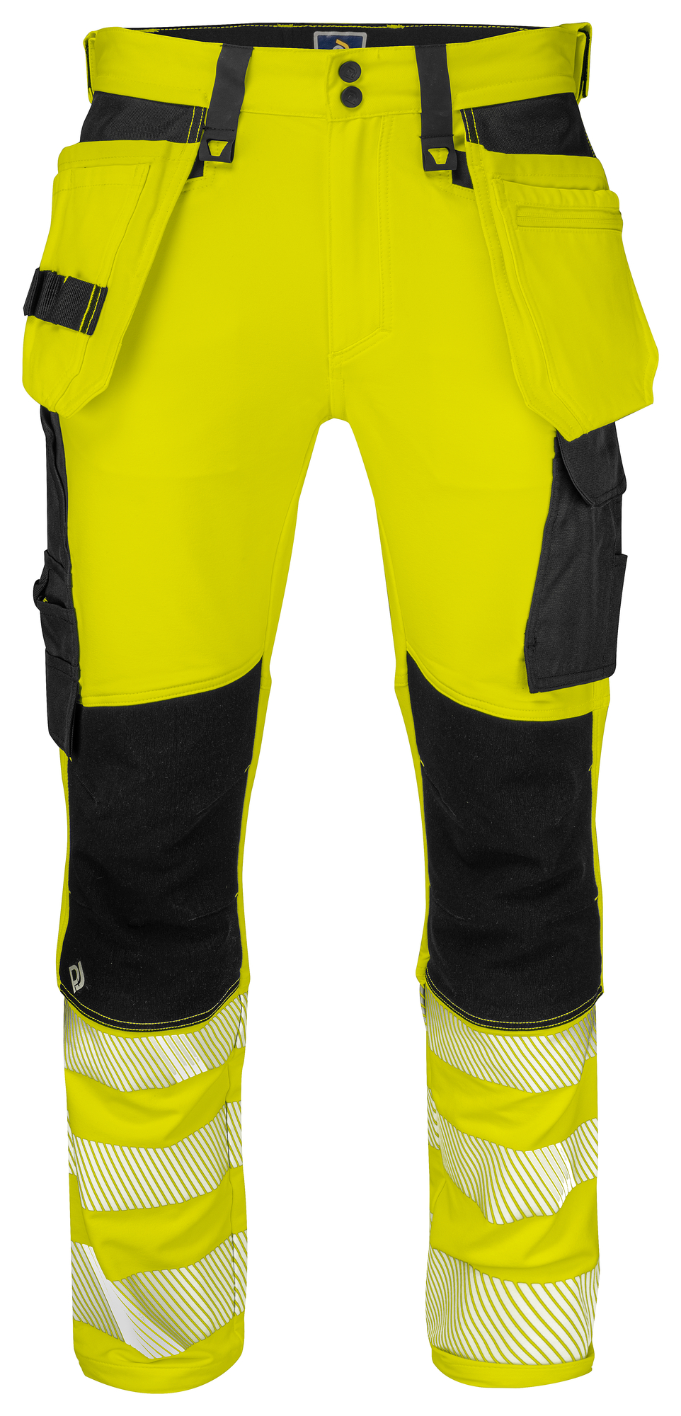 Pantalón de cintura totalmente elástico para una máxima libertad de movimientos y comodidad. Corte moderno. Elástico en 4 direcciones sobre los muslos y el asiento, elástico en 2 direcciones en la parte posterior de las rodillas y en la parte exterior de la parte inferior de la pierna. Aberturas de ventilación con cremalleras a lo largo de ambos lados de las piernas con forro de malla, también ventilación en la cintura. Bolsillos en las piernas, en el lado izquierdo bolsillo para herramientas y bolígrafos, bolsillo para móvil con cierre de velcro y gancho para sujetar la tarjeta de identificación. En el lado derecho bolsillo para cinta métrica y bolsillo con botón para herramientas. Posibilidad de acoplar sistema MOLLE en ambos lados, también posibilidad de añadir hammerloops mediante Velcro. Extremos de las piernas ajustables con cordón. Rodillas precurvadas. Bolsillos internos para protectores de rodilla, ajustables a dos niveles de altura. Dobladillos de las piernas reforzados con Cordura®, rodillas reforzadas con Kevlar elástico para mayor durabilidad y confort. Segmentos reflectantesd en 3M.