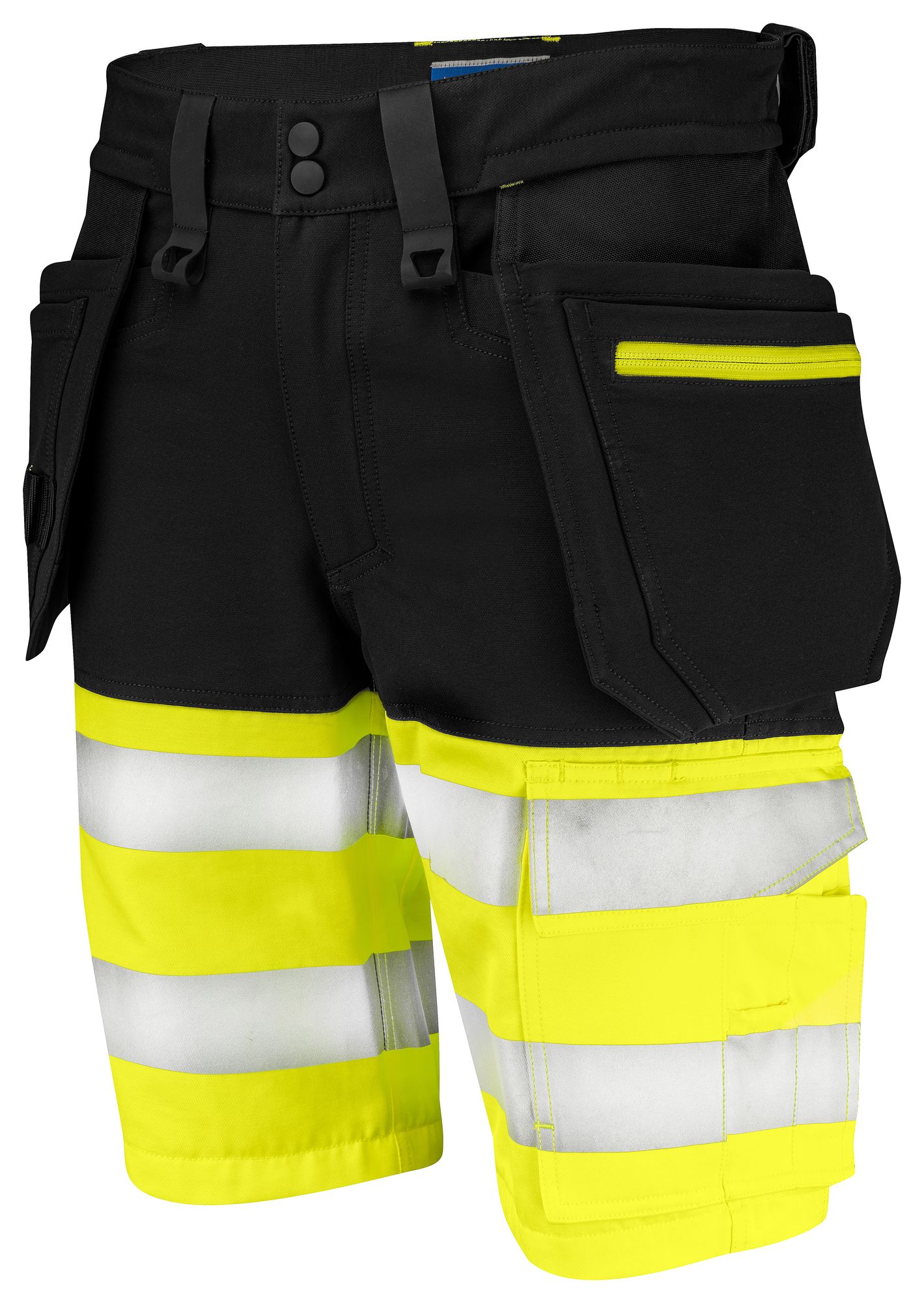 Pantalón corto elástico para una máxima libertad de movimientos. Corte moderno. Elástico en 4 direcciones en los muslos y la espalda. Los laterales de la parte superior no son elásticos para dar estabilidad al pantalón. Bolsillos tipo funda con compartimentos adicionales y refuerzo interno de Cordura®. Si se desea, se pueden quitar los bolsillos tipo funda descosiendo la costura de contraste de la parte trasera. Amplios bolsillos en ambos lados de la pierna. Bolsillo en la pierna izquierda para herramientas y bolígrafos, bolsillo para móvil con cierre magnético y gancho para sujetar la tarjeta de identificación. En el lado derecho bolsillo para cinta métrica y bolsillo con botón para herramientas. Posibilidad de añadir equipo complementario mediante velcro. Los bolsillos de la funda y los muslos están reforzados en Cordura® para una mayor durabilidad. Reflectantes en 3M.