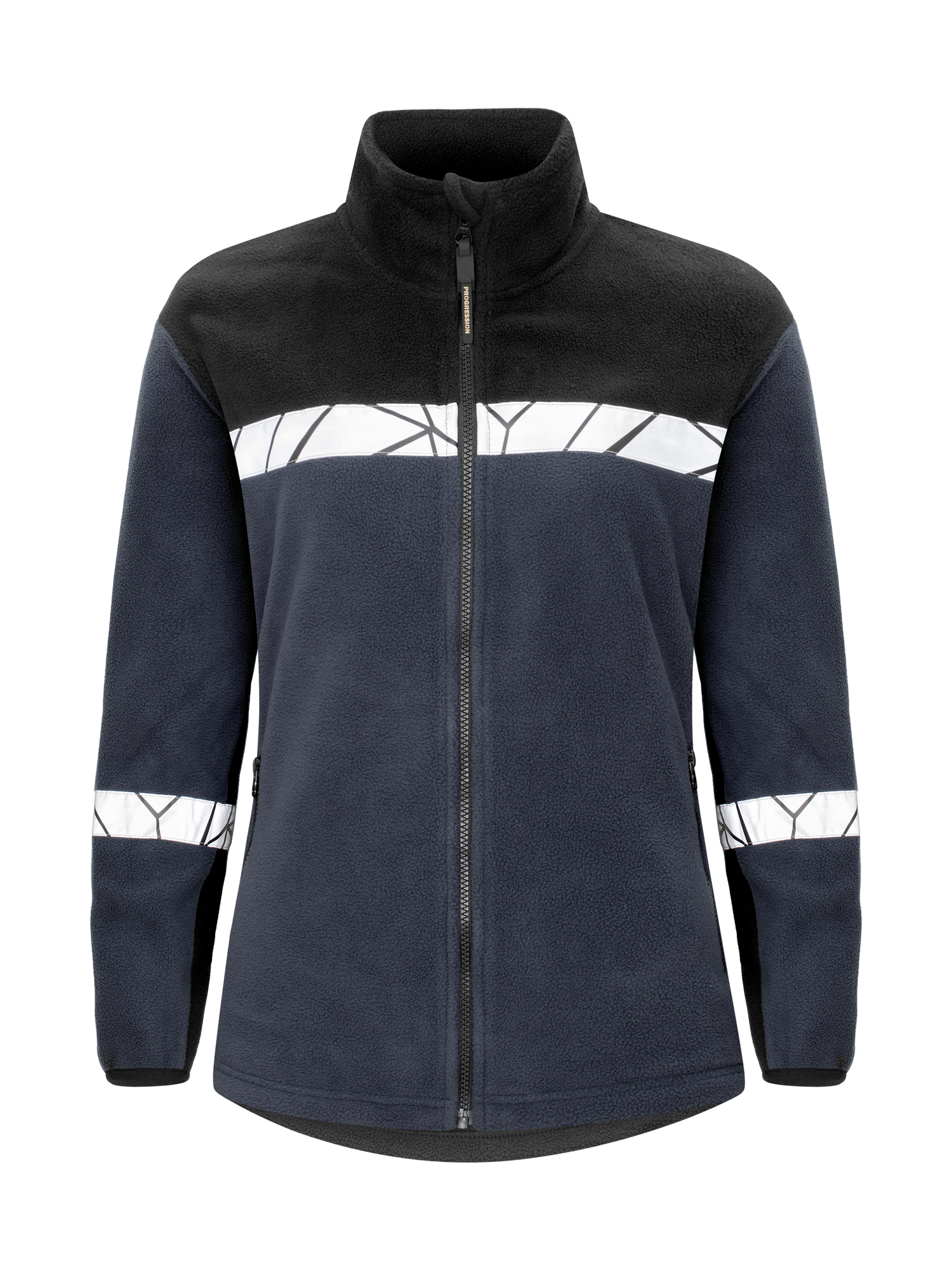 Forro polar con cremallera completa en la parte delantera, cubierta en la parte superior con protector de barbilla para evitar rozaduras. Cinta de contraste en el cuello. Bolsillos laterales a ambos lados con cierre de cremallera. Ajustable con cordón en la parte inferior. Bolsillo para chip de lavandería en la costura lateral izquierda interior.