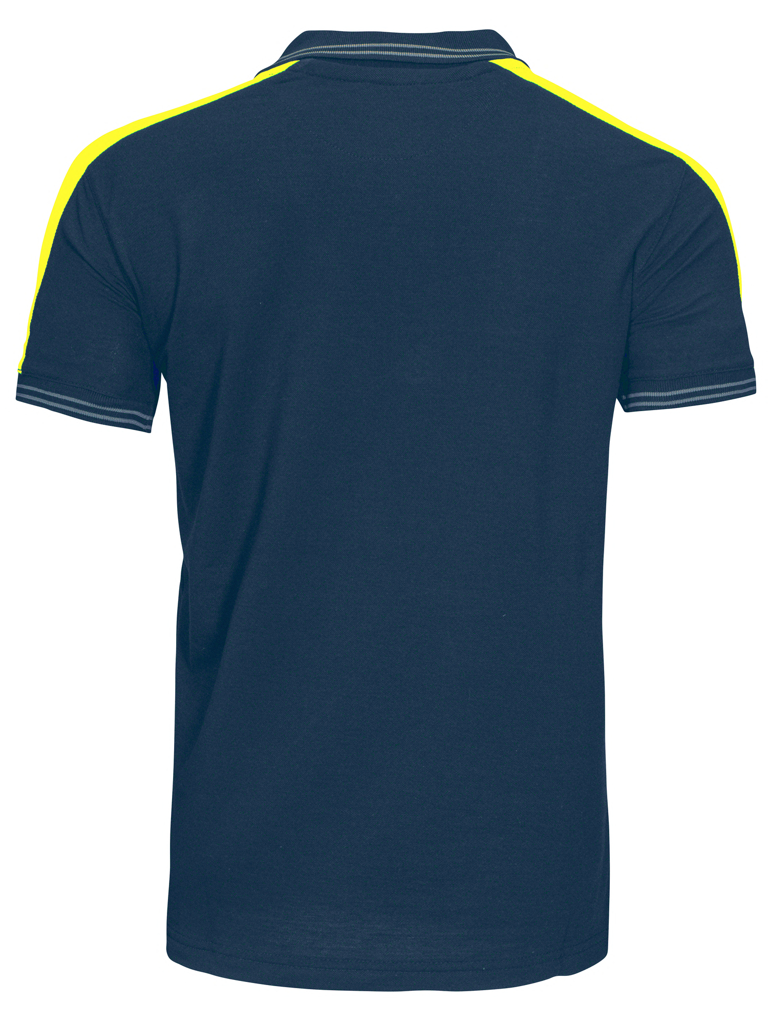 Piqué con tejido fluorescente sobre los hombros. Cuello y puños de punto elástico. Abertura en el cuello con tres botones. Espadín en los laterales.