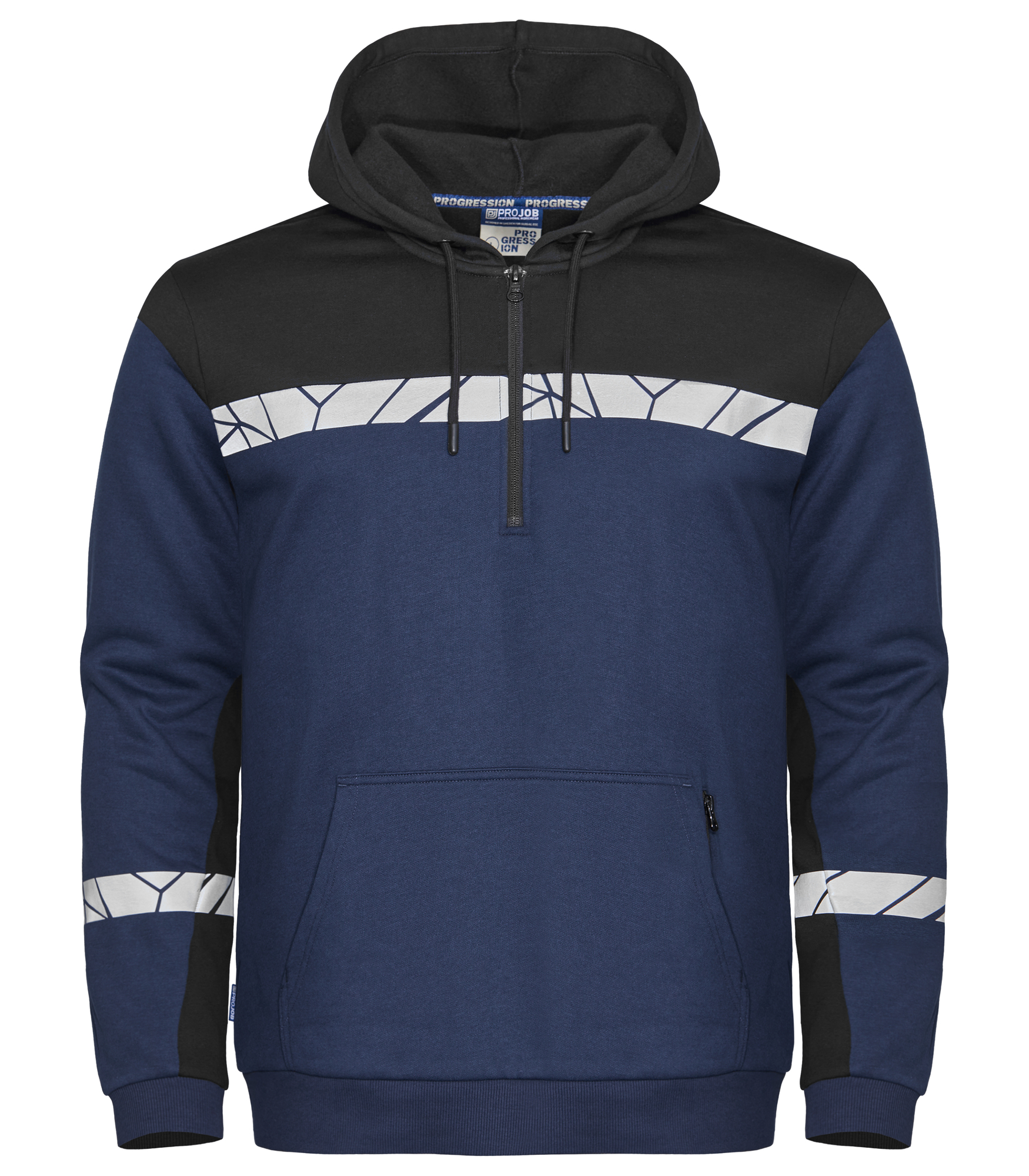 Sudadera con capucha y media cremallera frontal. Interior afelpado para una sensación agradable y suave. Bolsillo abierto en la parte delantera, con un bolsillo de seguridad adicional con cierre de cremallera. Capucha con cordón de ajuste. Cinta de contraste en el cuello. Rib 2×2 en los puños y en la parte inferior de la sudadera. Bolsillo para chip de lavandería en la costura lateral izquierda interior.