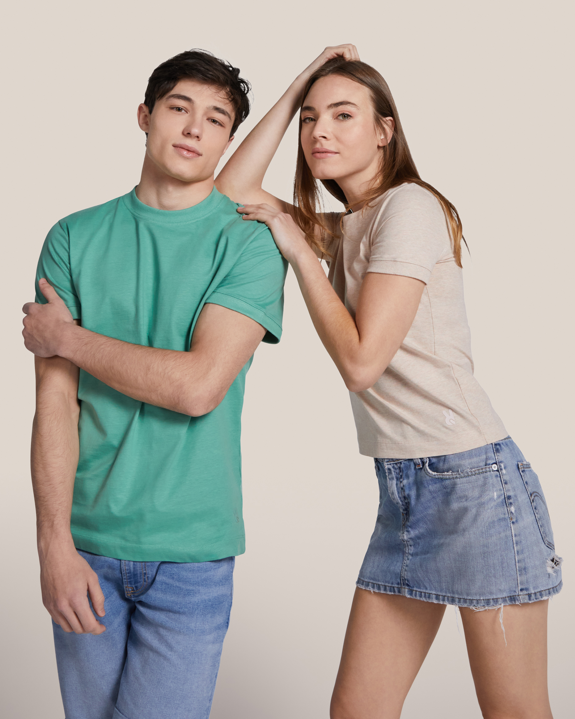Camiseta gruesa de mujer en manga corta de algodón. Cuello redondo y ribete mangas en canalé ancho 2×1. Cubrecosturas reforzado en cuello. Costuras laterales. Logo Roly a tono en bajo lateral izquierdo. Costura ancha en el bajo. Composición: 100% algodón, 210 g/m² Observaciones: * Etiqueta removible