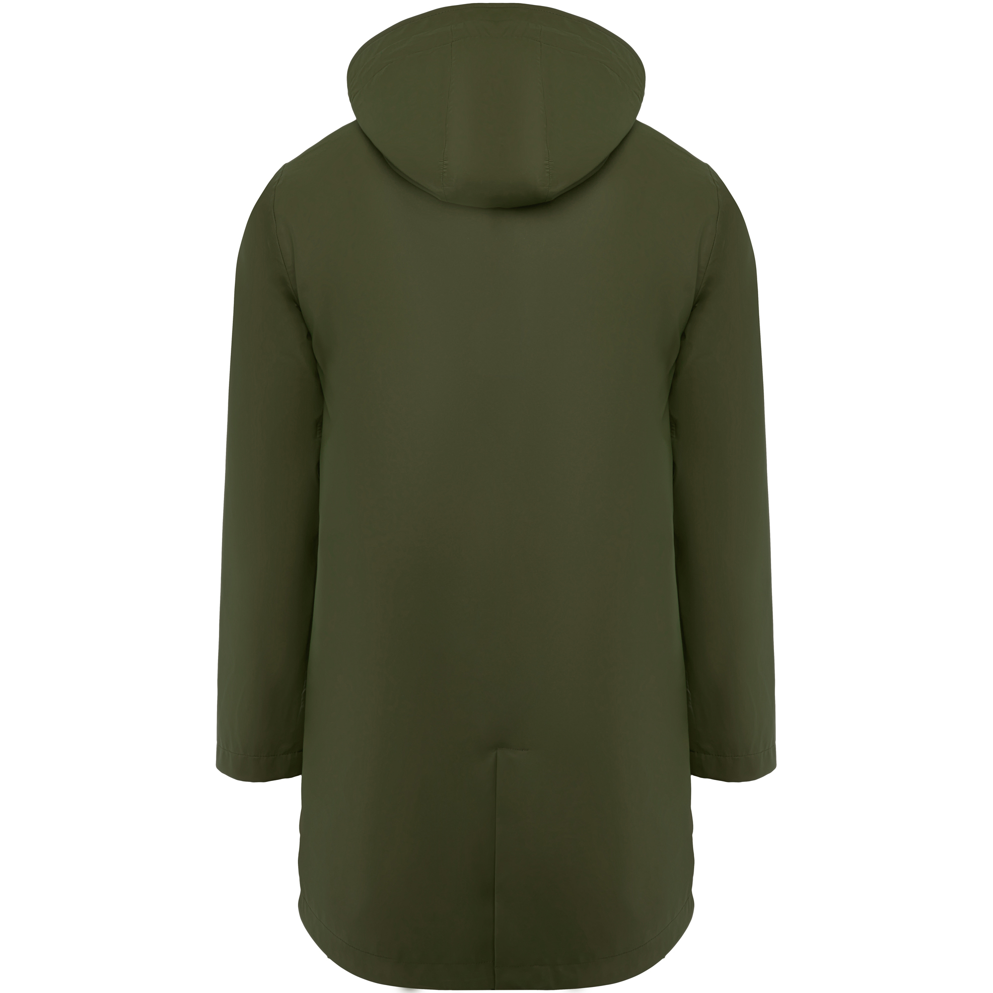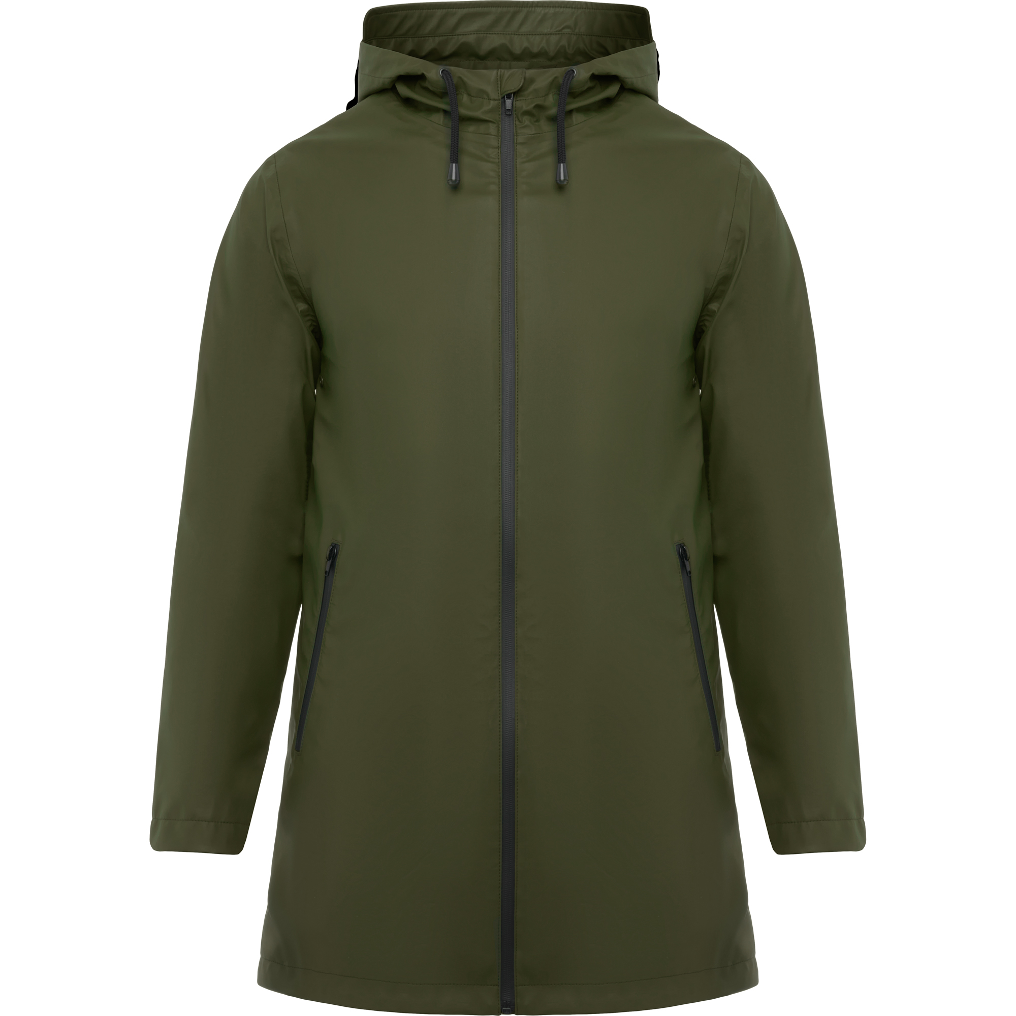 Chubasquero impermeable con capucha fija y visera. Cremallera frontal de doble dirección. Bolsillos laterales y costuras termoselladas. Cordón ajustable en capucha. Apertura trasera. Acceso interior para reprocesos.Composición: 100% poliéster, PU, 210 g/m².Observaciones: * Etiqueta removible. * Modelo impermeable. * Dúo concept.