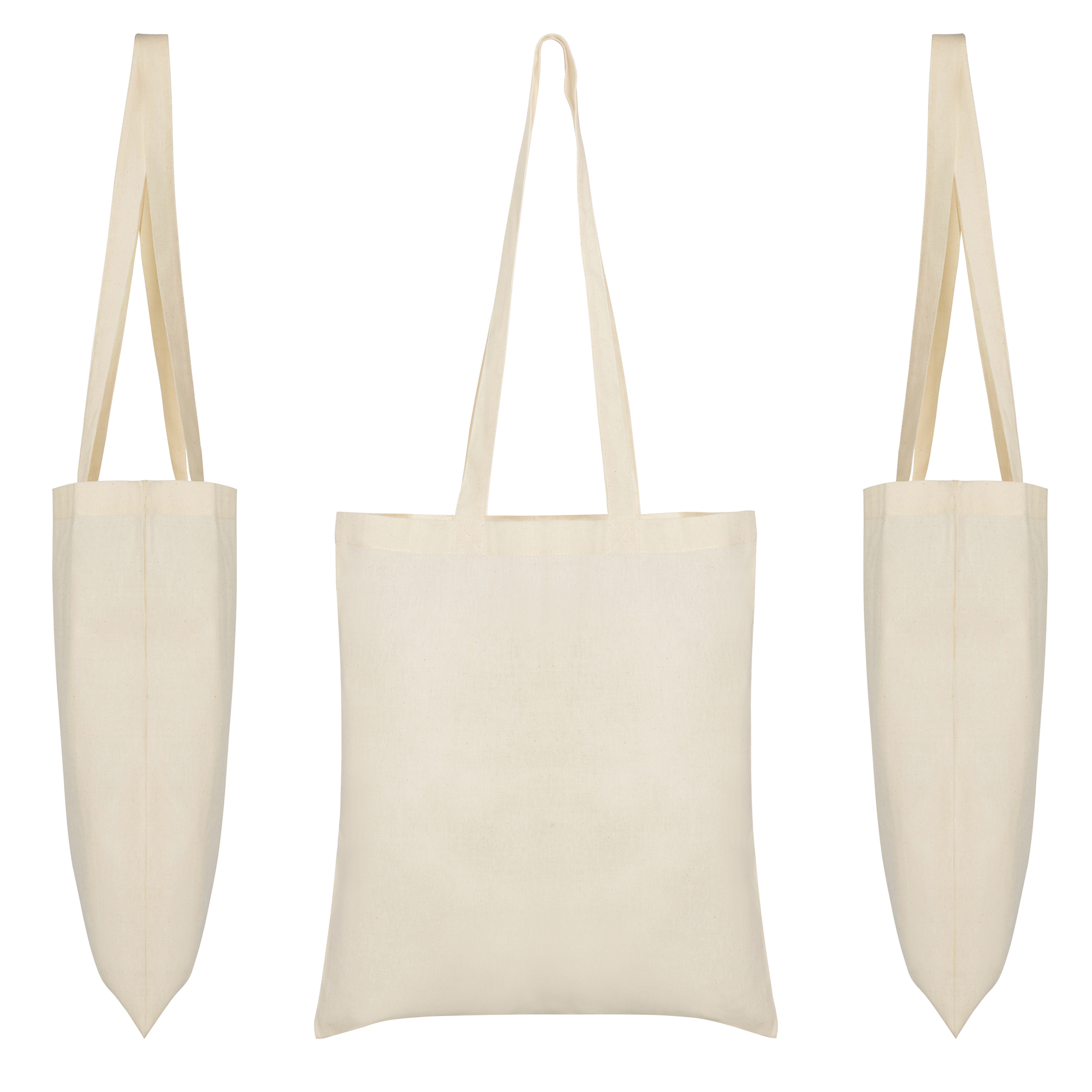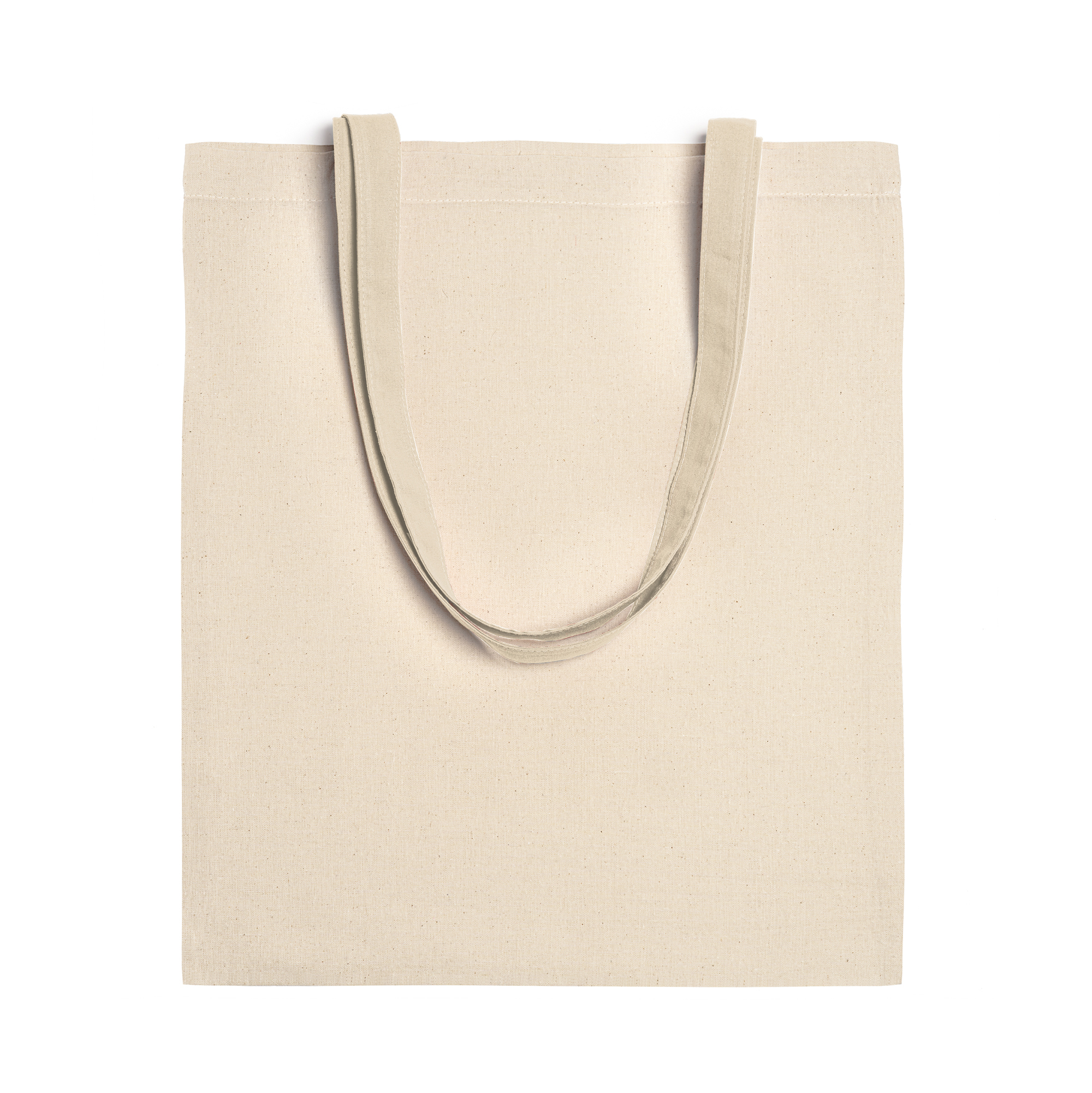 Bolsa fabricada en tejido de algodón en color natural de 140 g/m², con asa larga de cinta en el mismo color.