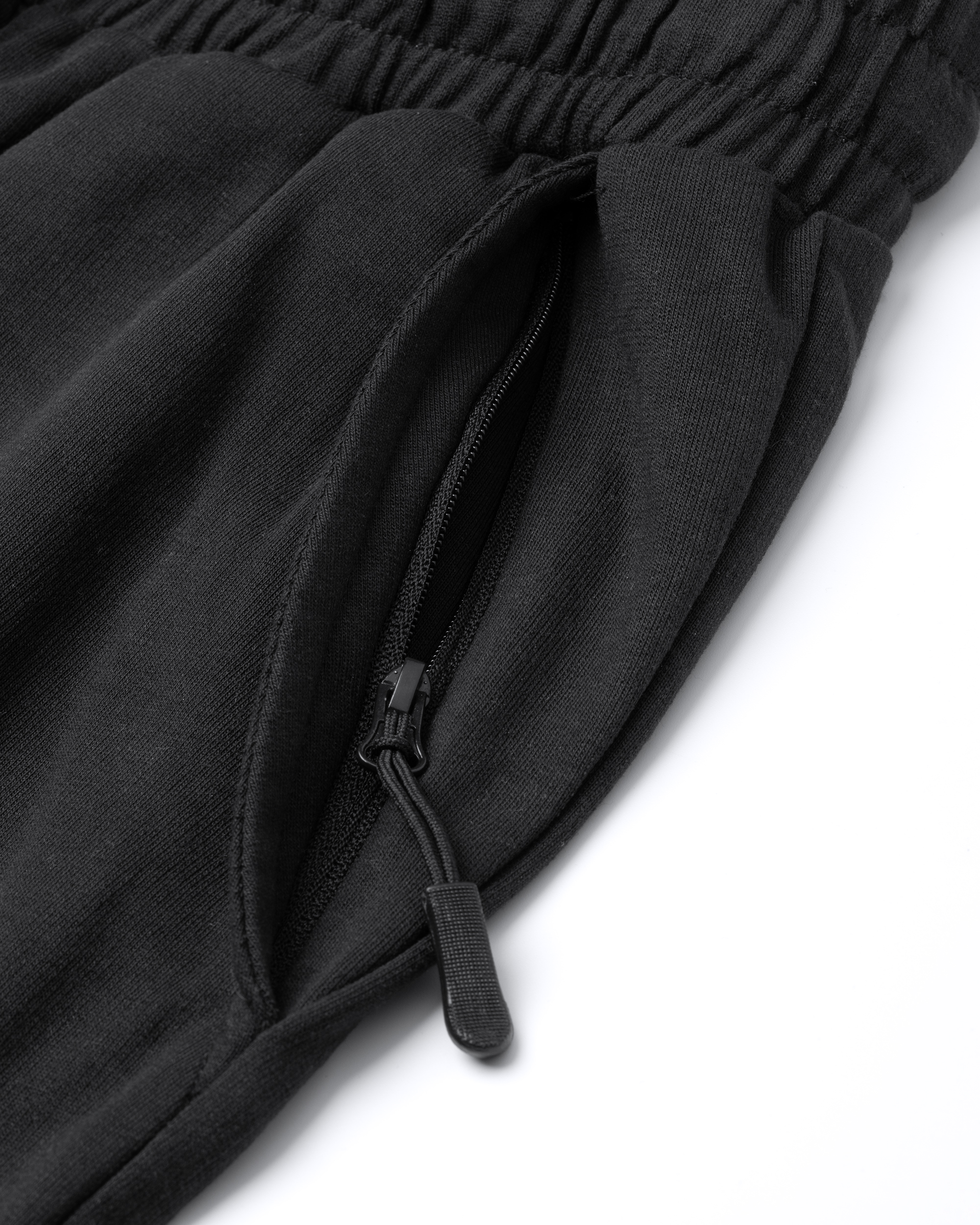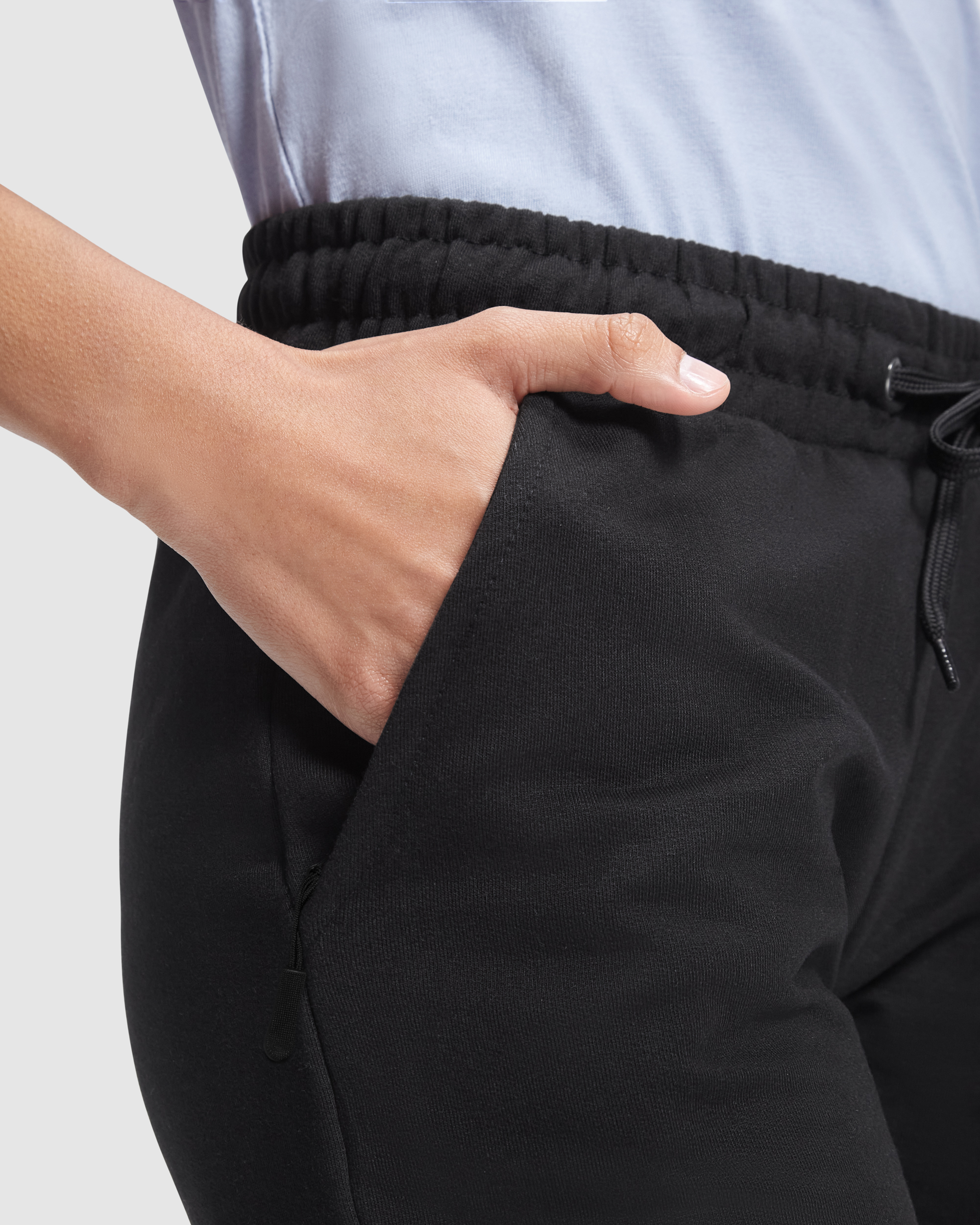 Pantalón largo recto de felpa no perchada básico. Bolsillos laterales con cremallera en talla de adulto. Cinturilla engomada con cordón ajustable y ojales metálicos. Puños en rib 1×1. Composición: 60% algodón / 40% poliéster, felpa no perchada, 280 g/m².