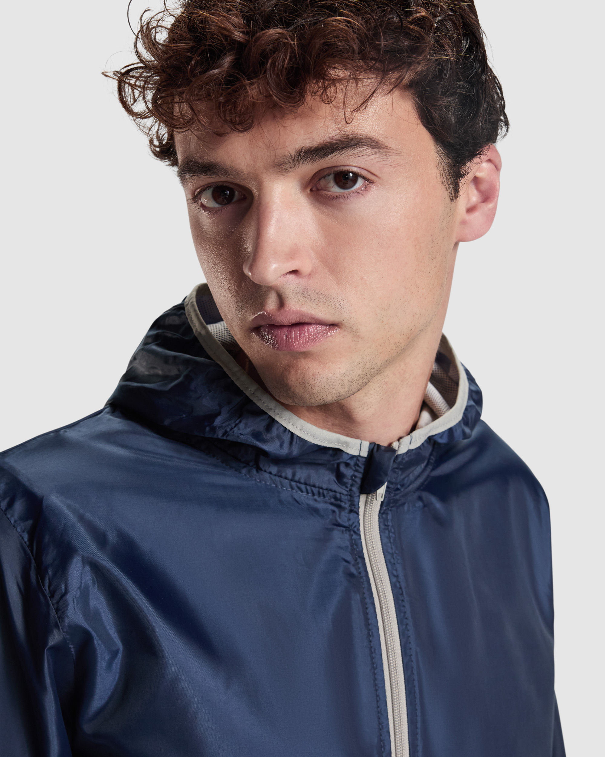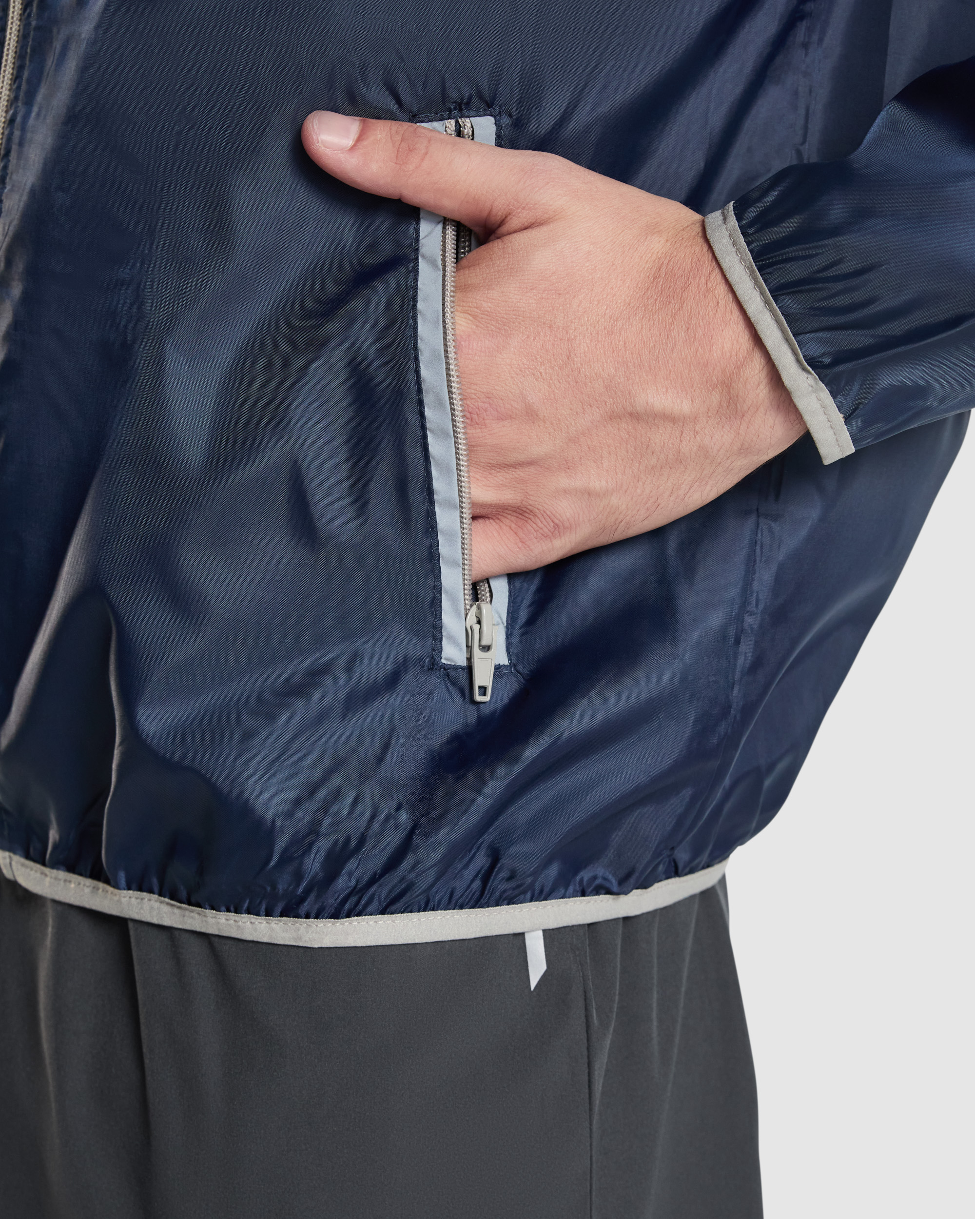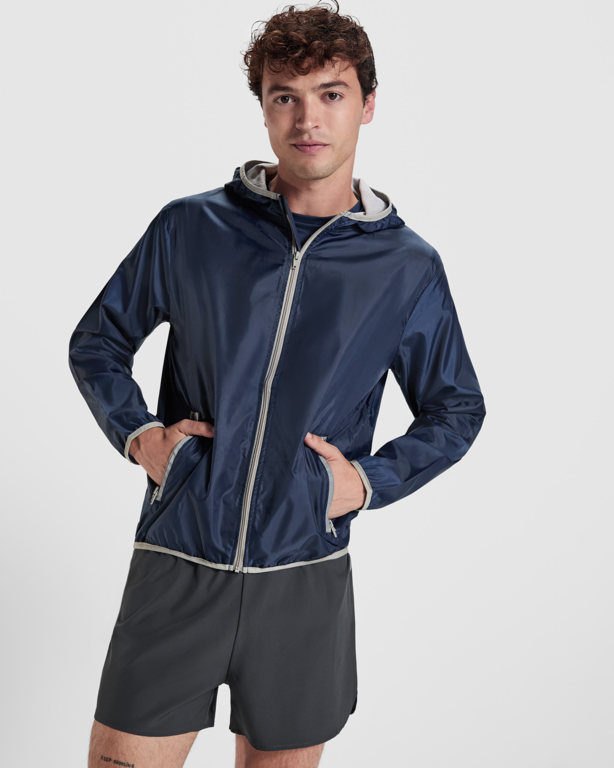 Cortavientos con capucha. Cremallera completa en contraste con protector de barbilla y tirador. Bolsillos delanteros con ribete reflectante. Bolsillo canguro a la espalda para guardar prenda, con cierre de velcro. Mangas y bajo de la prenda con ribete elástico en contraste. Interior de capucha con forro rejilla y cubrecosturas. Composición: 100% poliéster, 60 g/m².