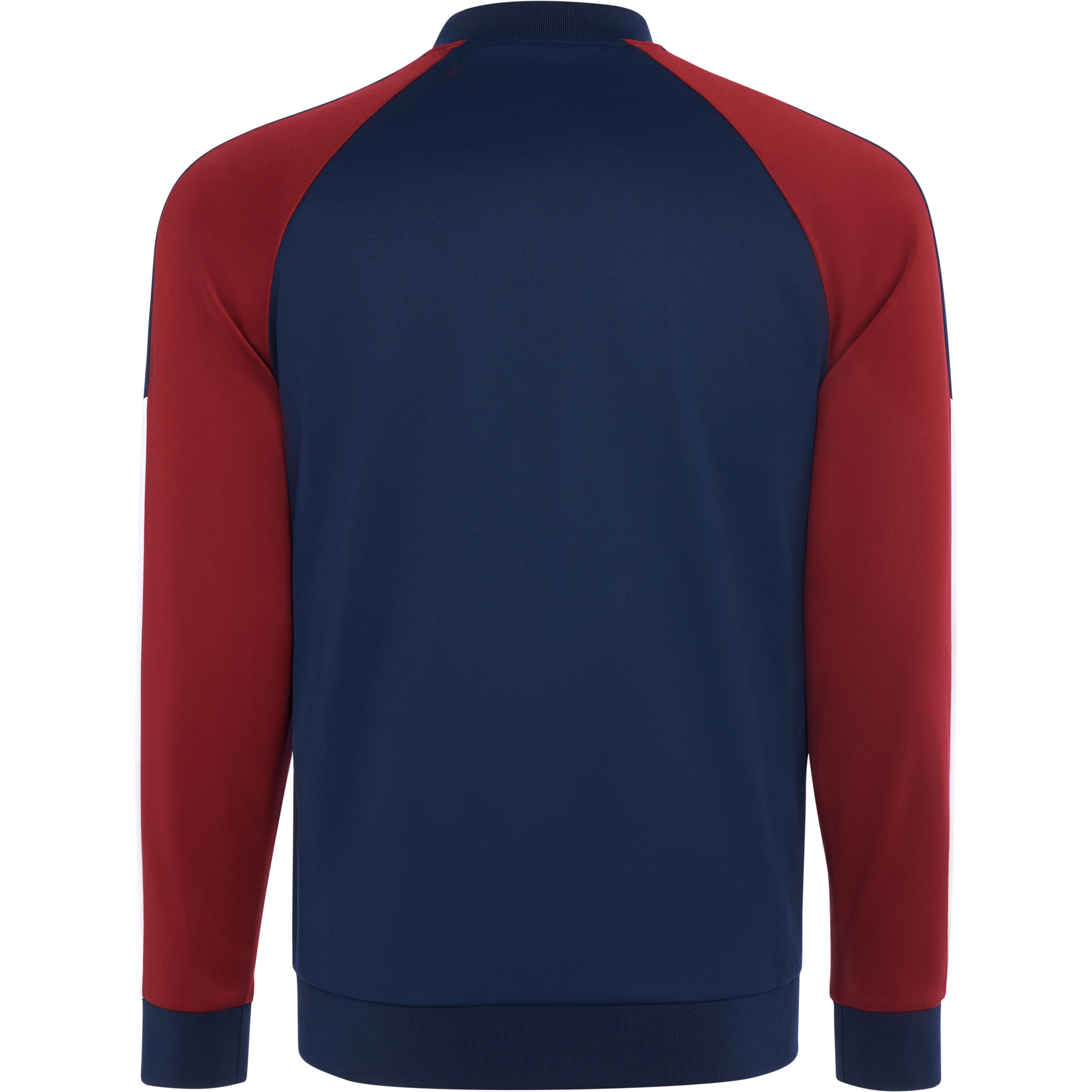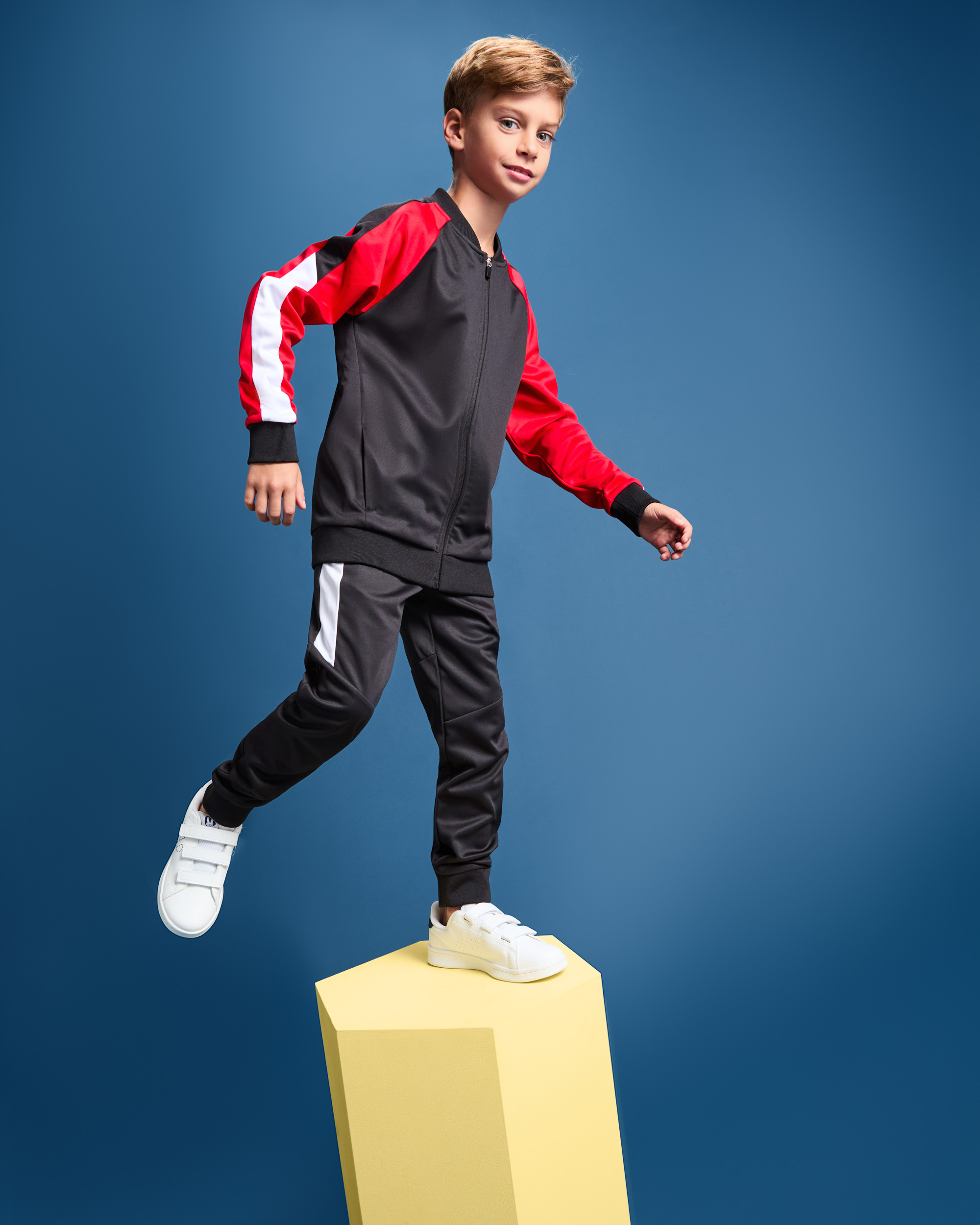 Chaqueta deportiva manga ranglán. Cremallera frontal. Dos bolsillos laterales con cremallera. Rib 1×1 en cuello, puños y bajo. Cubrecosturas a contraste. Mangas a contraste de color con bandas a lo largo de la manga. Opciones de color para combinar con pantalón URUS. Composición: 100% poliéster piqué perchado, 210 g/m² Observaciones: *ETIQUETA REMOVIBLE DE PAPEL