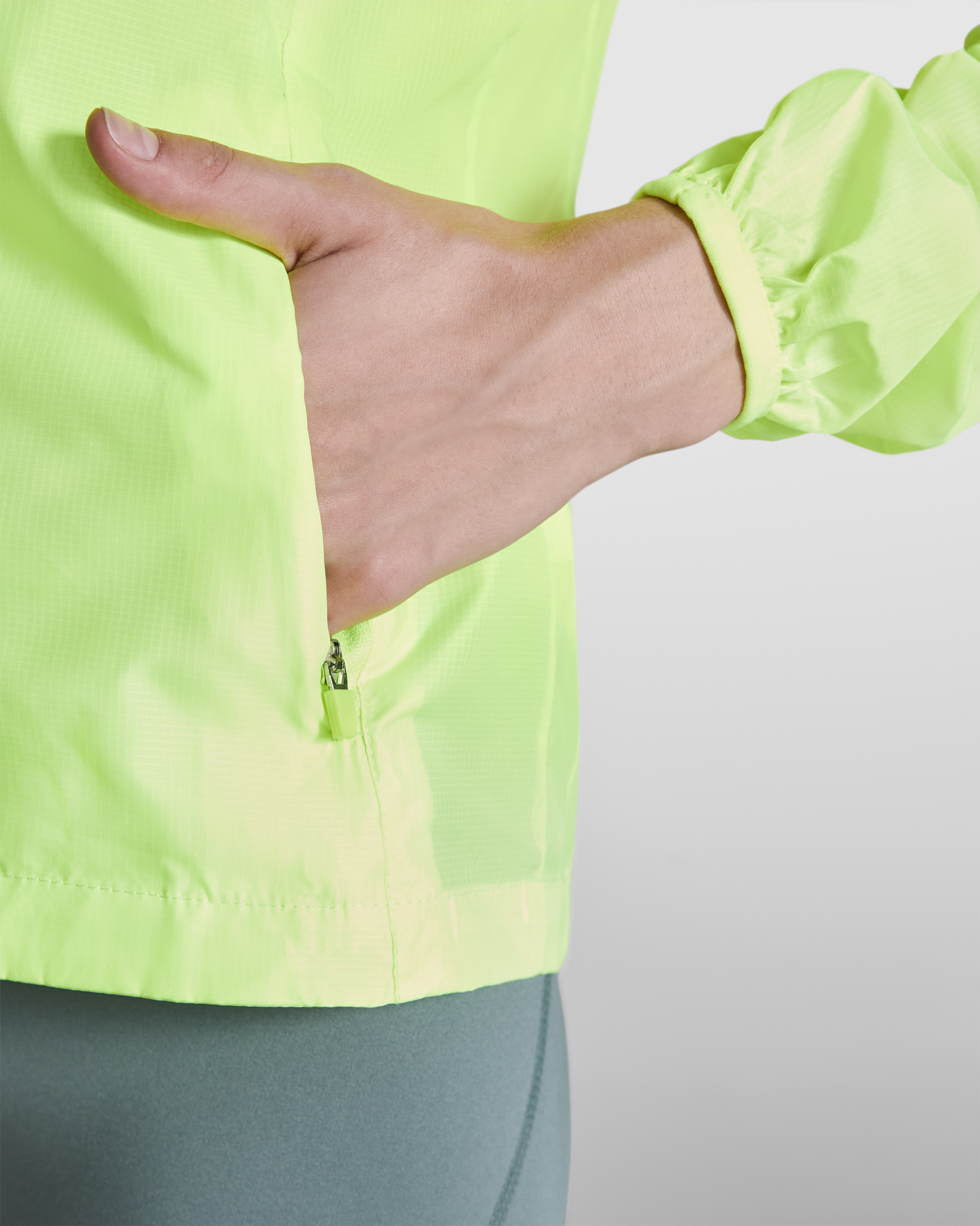 Chaqueta cortavientos en tejido técnico ligero. Interior de cuello forrado en tejido transpirable con cubrecosturas. Cremallera invertida con detalle reflectante, protector de barbilla y tirador. Corte de mangas ranglán. Tejido transpirable en la parte de las sisas. Bolsillos delanteros con cremalleras. Corte entallado. Bolsillo interior para guardar la prenda. Puños con ribete elástico. Detalles reflectantes en espalda. Bajo con espalda ligeramente más larga. Composición: 100% poliéster cuadrillé, 70 g/m². Observaciones: *Etiqueta removible.