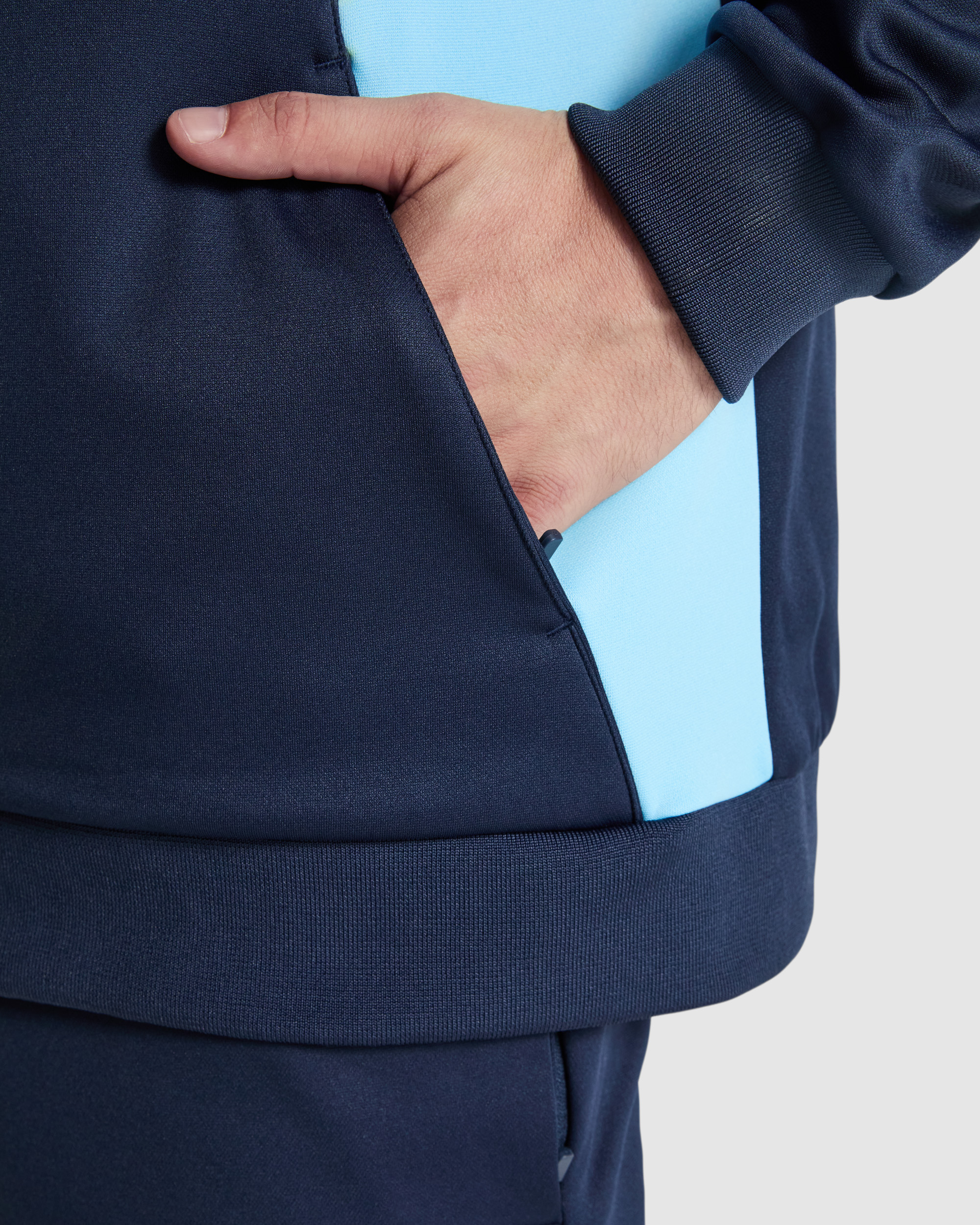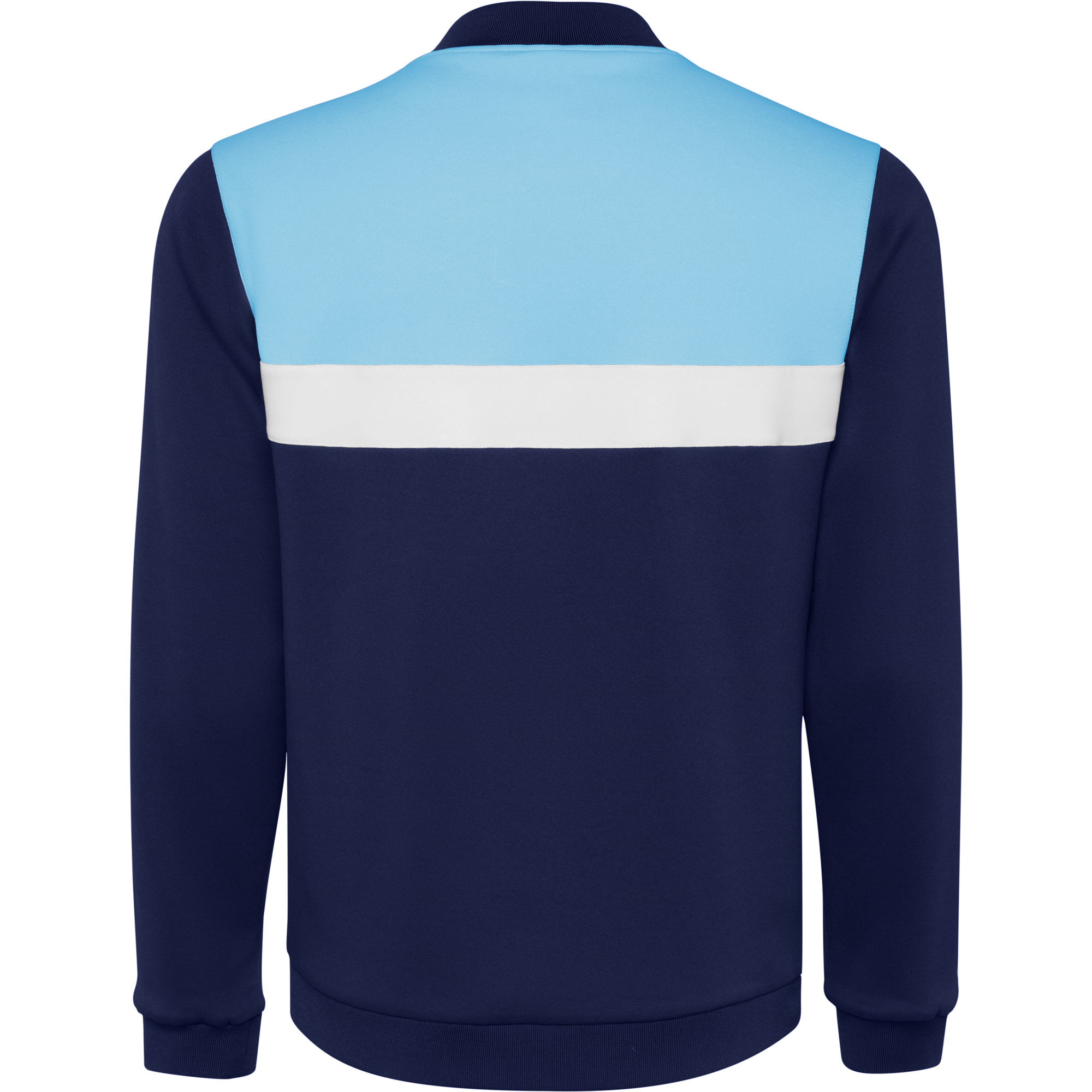 Chaqueta deportiva con cremallera frontal perchada. Bolsillos laterales con cremallera. Piezas a contraste de color, una blanca en pecho especial para bordados. Cuello, puños y cintura en canalé de 1×1.