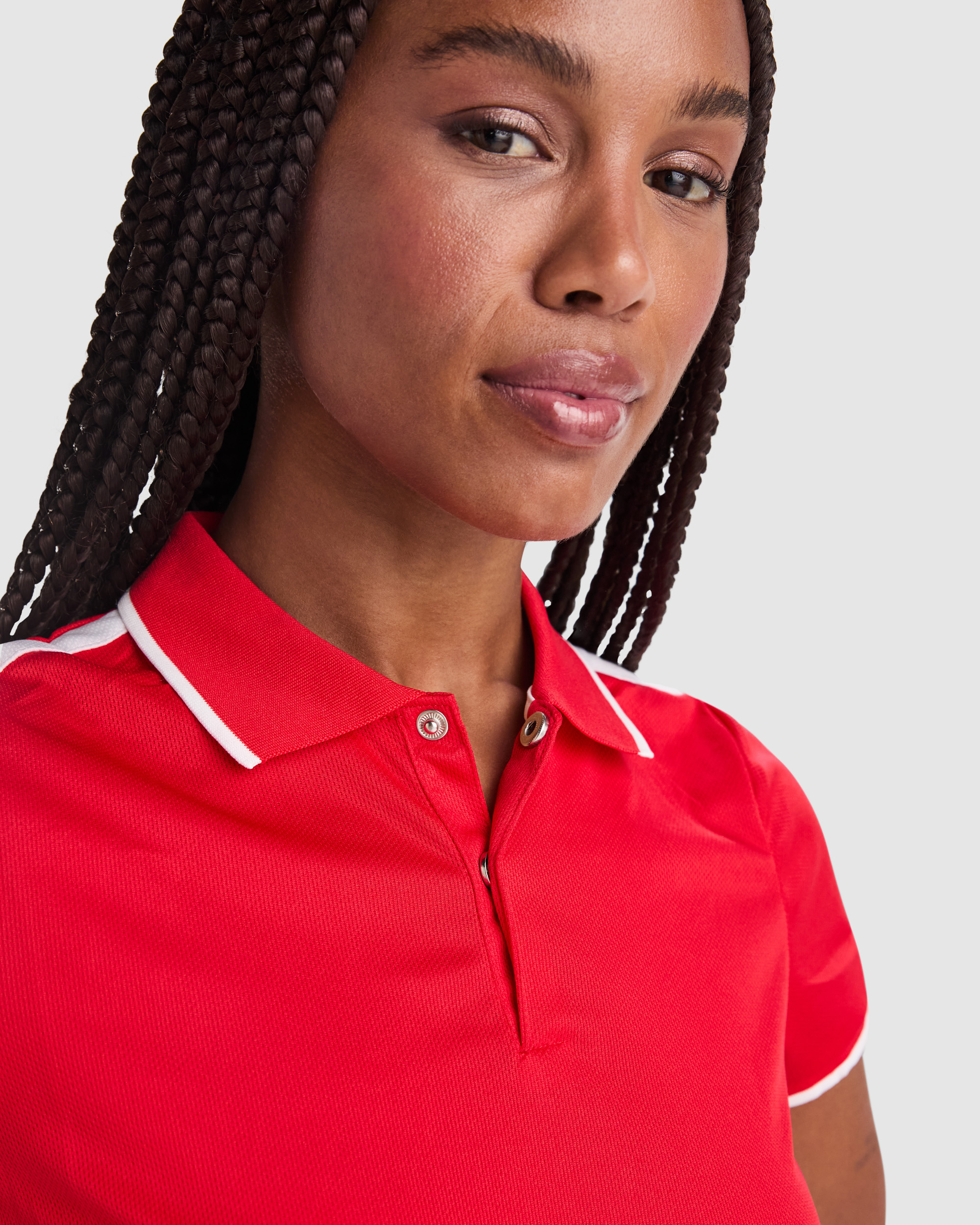 Polo técnico manga corta entallado transpirable. Antibacteriano. Aperturas laterales. Pieza en hombros y bocamanga a contraste. Cuello y puños rib 1×1 al tono con detalle a contraste. Tapeta con botones a presión, uno visible a contraste de color y otro invisible dentro de la tapeta. Cubrecosturas del mismo tejido a contraste. Certificado GRS. Composición: 50% poliéster reciclado / 50% poliéster antibacteriano,140 g/m².