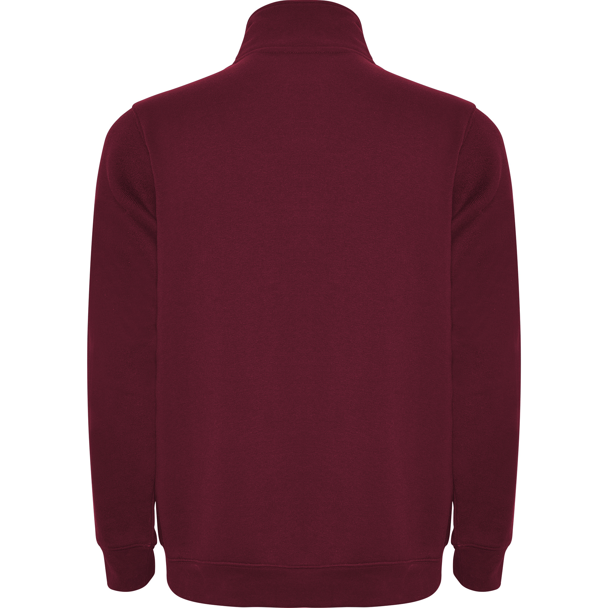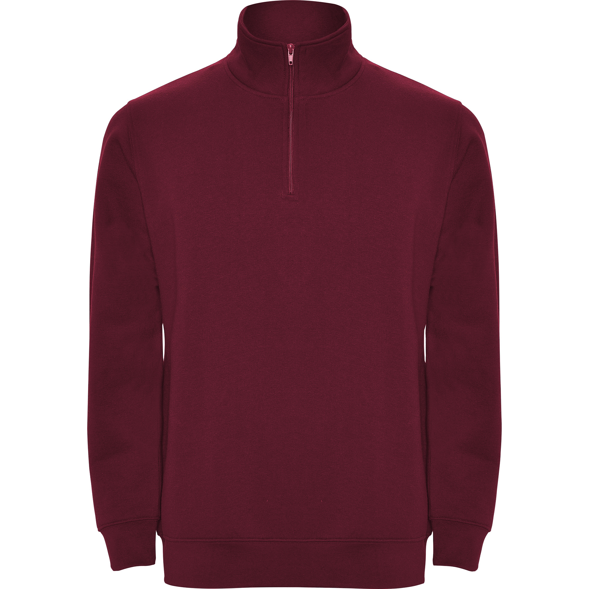 Sudadera unisex media cremallera y cuello alto. Cremallera al tono. Puños y cinturilla en canalé 2×1 con elastano. Cubrecosturas del mismo tejido. Composición: 50% algodón / 50% poliéster, felpa perchada, 280 g/m².
