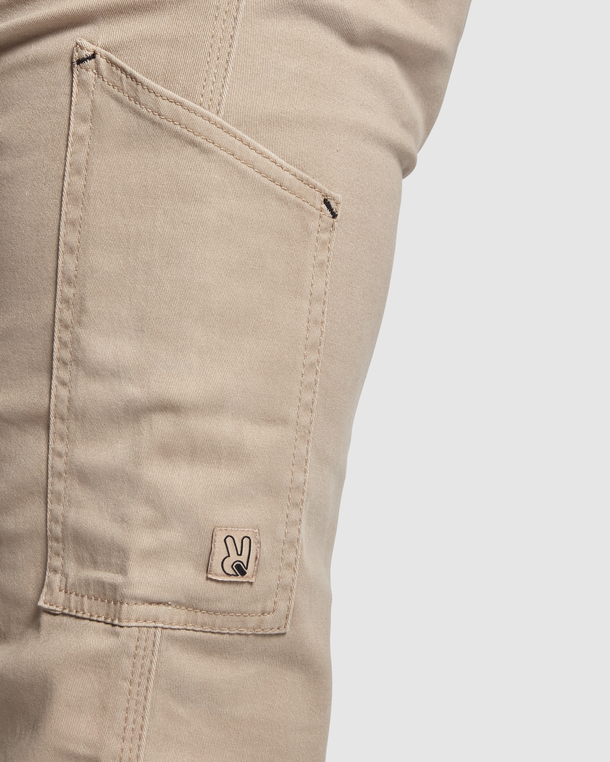 · Un bolsillo cargo con tapeta y cierre de velcro en la pierna izquierda y uno alargado para herramientas en la derecha.