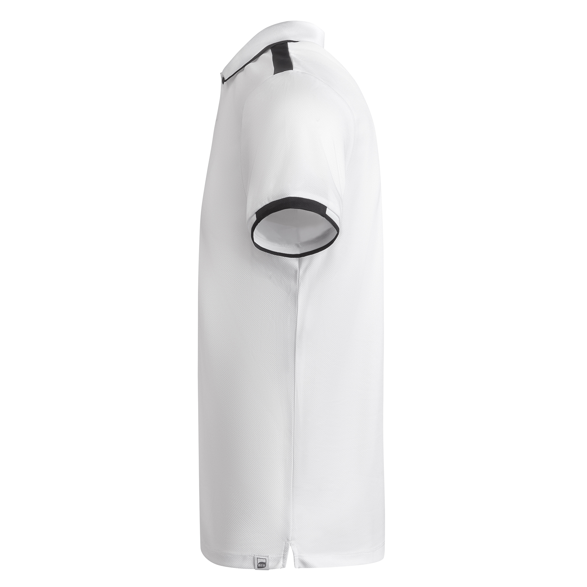 Polo técnico manga corta transpirable bicolor. Antibacteriano. Aperturas laterales. Pieza en hombros y bocamanga a contraste. Cuello y puños rib 1×1 al tono con detalle a contraste. Tapeta con botones a presión, uno visible a contraste de color y otro invisible dentro de la tapeta. Cubrecosturas del mismo tejido a contraste. Certificado GRS.
